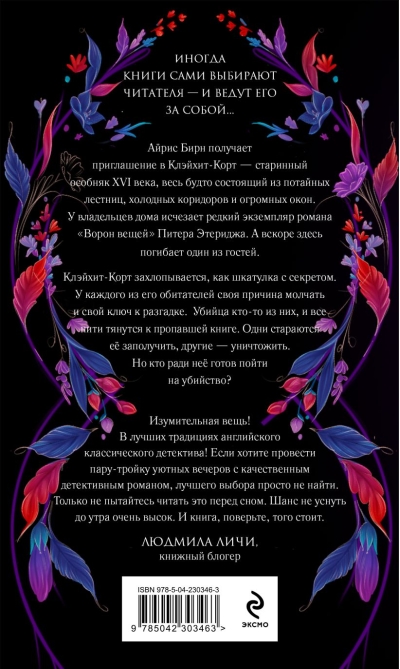 Айрис Бирн получает приглашение в Клэйхит-Корт — старинный особняк XVI века, весь будто состоящий из потайных лестниц, холодных коридоров и огромных окон. У владельцев дома исчезает редкий экземпляр романа «Ворон вещей» Питера Этериджа. А вскоре здесь погибает один из гостей.