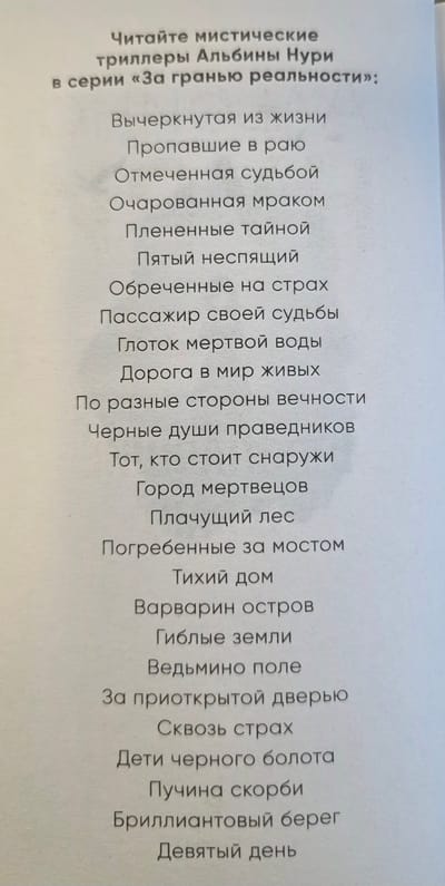 Романы Альбины Нури — целый мир, в котором реальность переплетается с мистикой и потусторонним миром, где действуют законы, отличные от законов разума. Герои сталкиваются с необъяснимыми явлениями, идущими вразрез с обыденной картиной мира, и им предстоит через многое пройти, чтобы вернуть свою жизнь в привычное русло. Романы Альбины Нури нравятся как читателям, так и критикам.