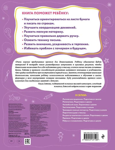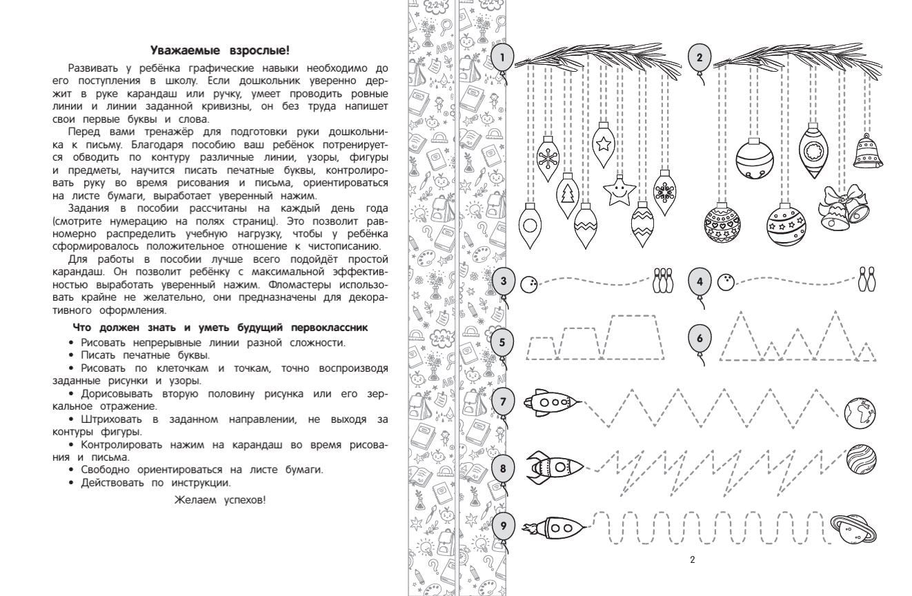 Эта книга для детей от 5 лет поможет дошкольнику развить мелкую моторику рук, научиться писать буквы, как это делают ученики первого класса, и сформировать красивый почерк. В прописях более 365 упражнений по чистописанию, рассчитанных на каждый день года. Это способствует равномерному распределению учебной нагрузки и формированию положительного отношения ребёнка к обучению в школе. Дошкольник потренируется обводить рисунки и рисовать их по образцу, писать элементы букв, буквы и целые слова. Он научится ориентироваться на листе бумаги, писать, придерживаясь строки, станет внимательным, аккуратным, самостоятельным и приобретёт другие важные навыки, необходимые при обучении в школе.
