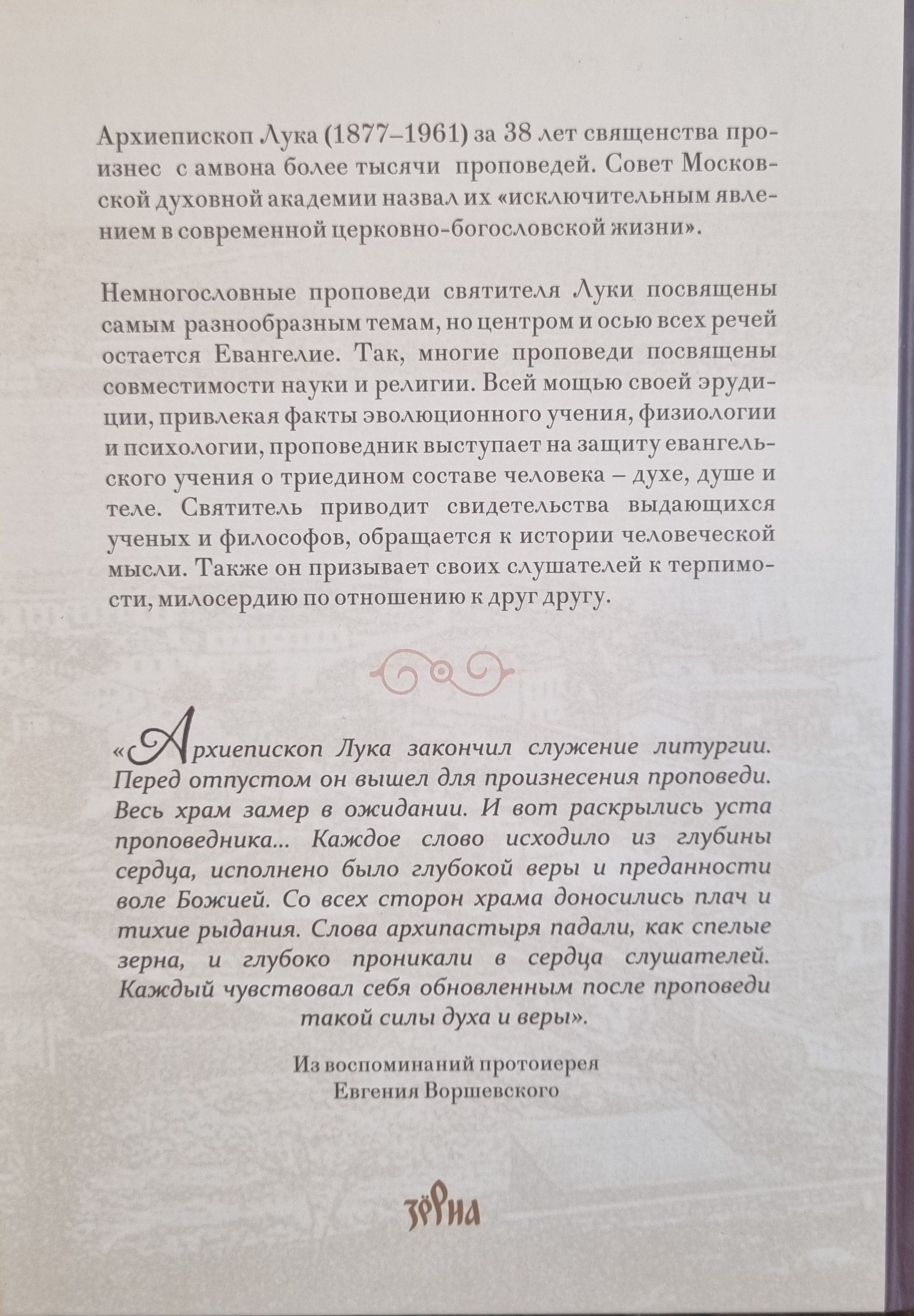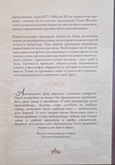Архиепископ Лука (Войно-Ясенецкий; 1877-1961) за 38 лет священства произнес с амвона более тысячи проповедей. Совет Московской духовной академии назвал их «исключительным явлением в современной церковно-богословской жизни». Немногословные проповеди святителя Луки посвящены самым разнообразным темам, но центром и осью всех речей остается Евангелие. Так, многие проповеди посвящены совместимости науки и религии. Всей мощью своей эрудиции, привлекая факты эволюционного учения, физиологии и психологии, проповедник выступает на защиту евангельского учения о триедином составе человека - духе, душе и теле.
