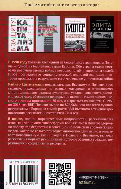 Райнер Цительманн показывает, как Вьетнаму и Польше, двум странам, находящимся на разных материках и относящимся к принципиально разным культурам, удалось совершить экономическое чудо, обеспечив непрерывно высокие темпы экономического роста на протяжении 30 лет, и вырваться из нищеты. С 1989 по 2018 год ВВП Польши вырос на 826,96%, что является лучшим результатом в Европе; а темпы роста ВВП Вьетнама в течение трех последних десятилетий составляют 7% в год.