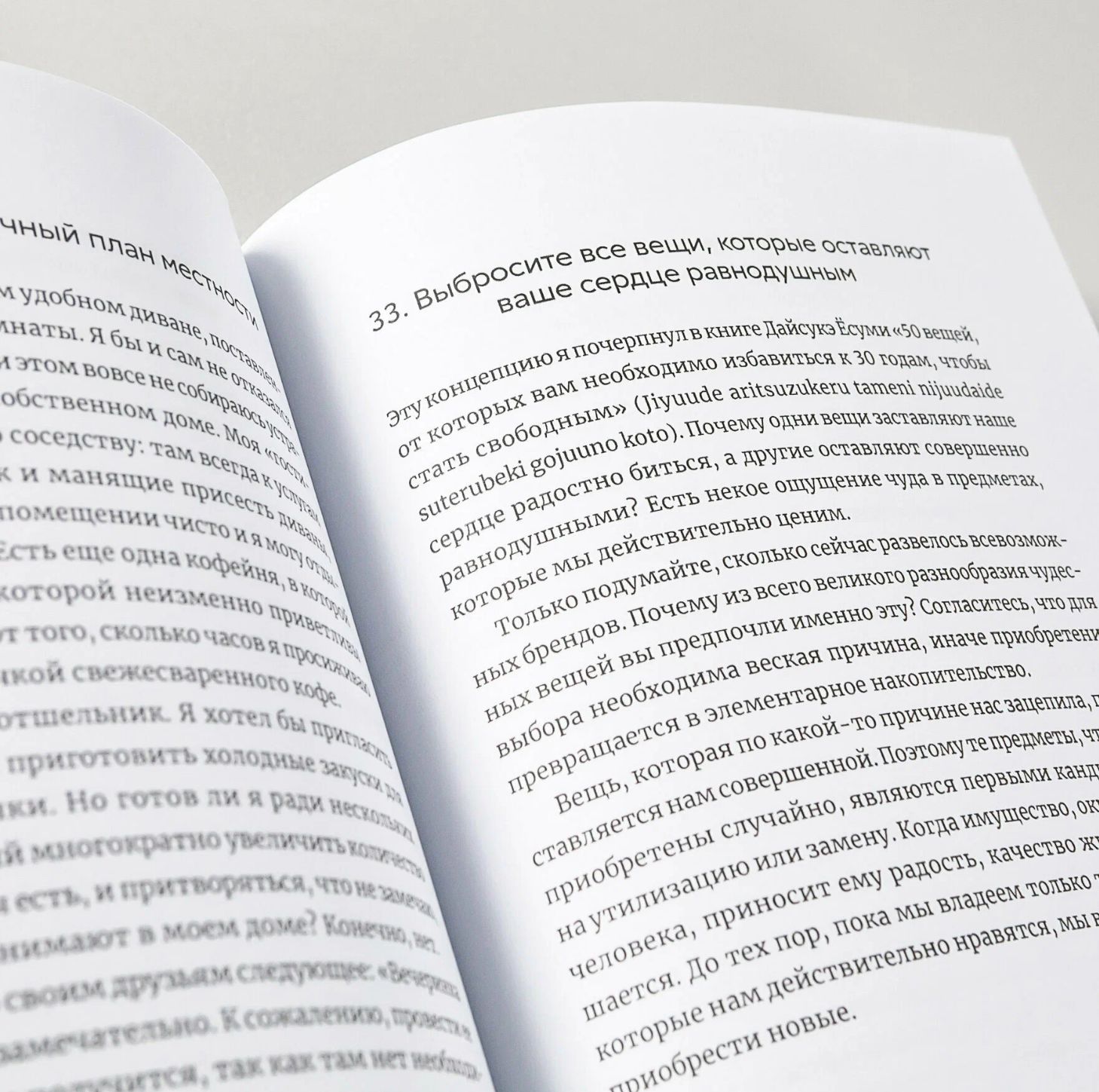 «Прощайте, вещи!» — книга самого известного минималиста в Японии и мировой бестселлер, переведенный на несколько языков. Ее автор Фумио Сасаки — обычный парень, который покупал кучу вещей, полагая, что это повысит его самооценку или сделает его счастливее. Когда он понял, что превратил свое и так небольшое жилище в забитое хламом пространство, то решил, что с него довольно и нужно что-то менять. Сасаки увлекся идеями минимализма и распрощался со многими вещами, которые ему мешали. Эффект оказался поразительным: он научился обходиться малым, стал меньше времени тратить на уборку, больше внимания уделять тому, что действительно важно, — и, по его собственному признанию, обрел истинные свободу и счастье.