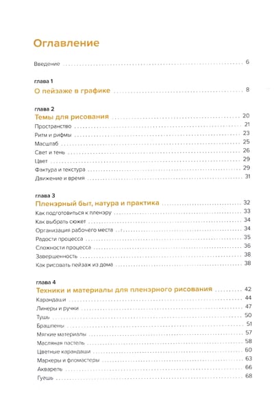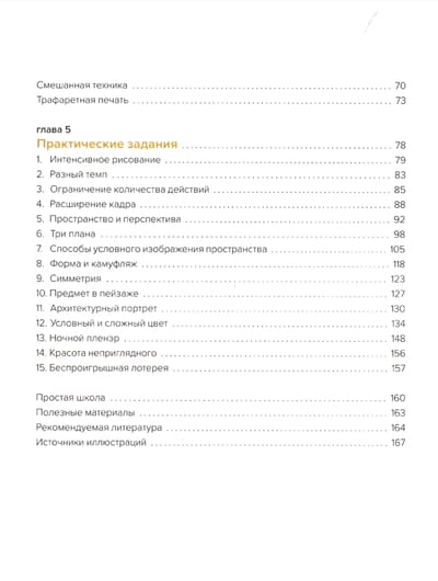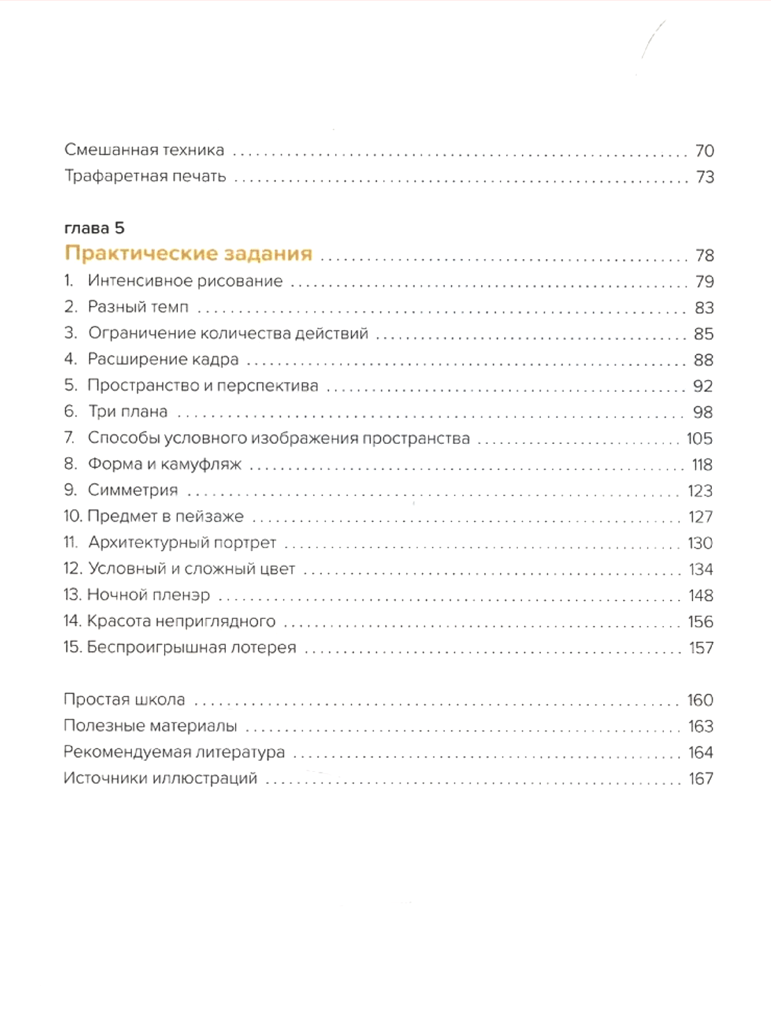 Это сборник рекомендаций и упражнений, которые можно выполнять в любой последовательности, чтобы организовать личную рисовальную практику и сделать ее более структурированной. Автор предлагает задания, которые способствуют развитию наблюдательности, помогают увидеть натуру под неожиданным углом и поставить перед собой новые задачи. Кроме упражнений вы найдете в книге советы по организации рабочего места на пленэре, краткий обзор графических материалов, наблюдения об особенностях пленэрного рисования и другие полезные советы.