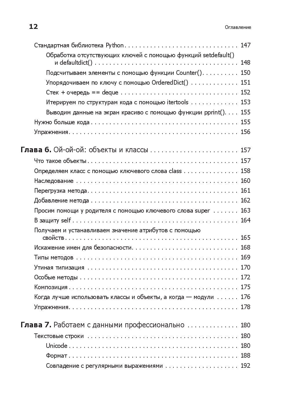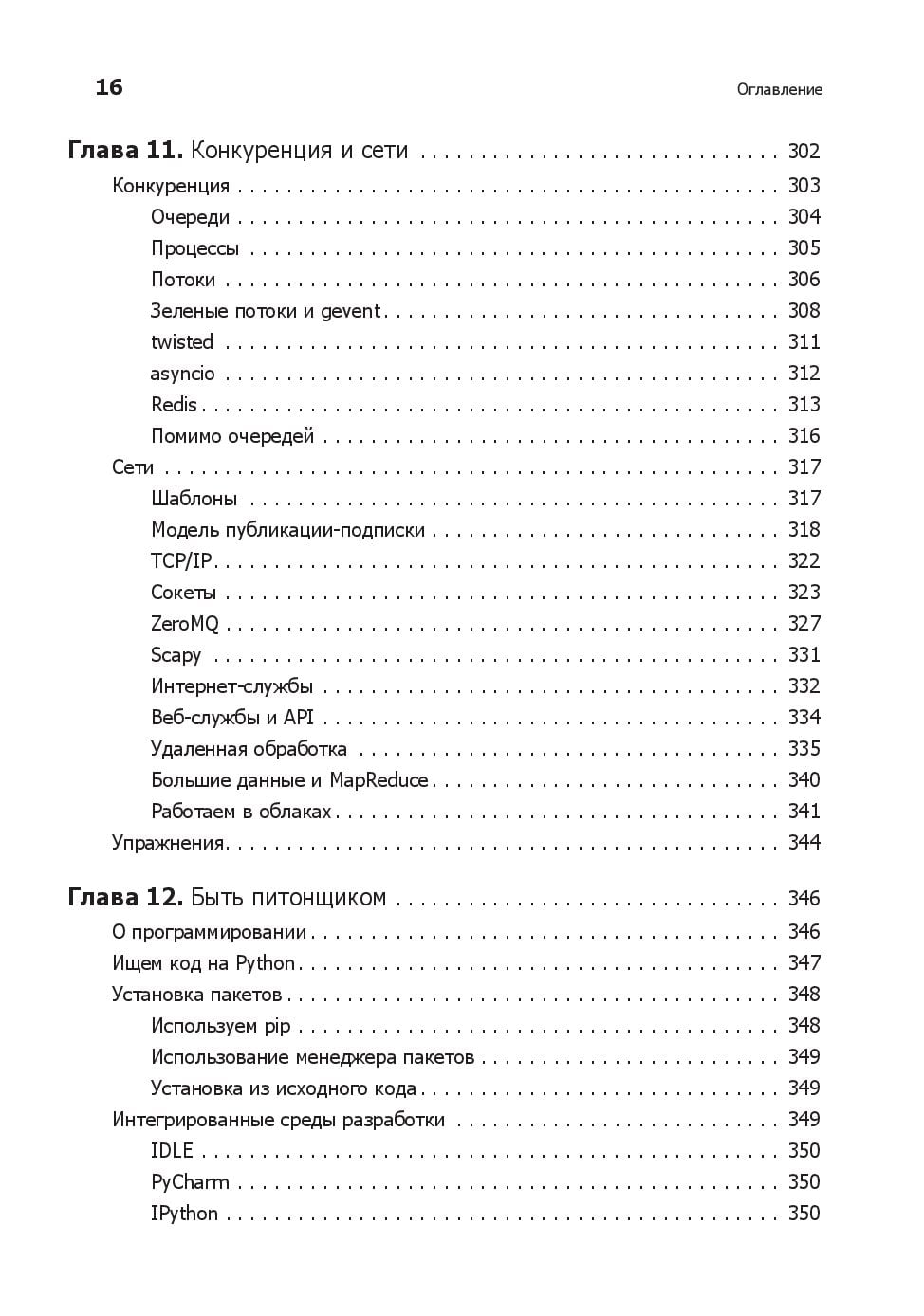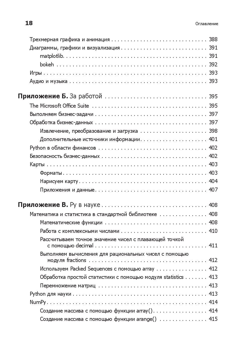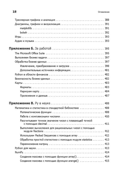 Любому программисту нужно знать не только язык, но и его возможности. Вы начнете с основ Python и его стандартной библиотеки. Узнаете, как находить, загружать, устанавливать и использовать сторонние пакеты. Изучите лучшие практики тестирования, отладки, повторного использования кода и получите полезные советы по разработке. Примеры кода и упражнения помогут в создании приложений для различных целей. Что изменилось? - Абсолютно новые 100 страниц (там есть котики). - Глав стало большое, но они стали короче. - Появилась глава, посвященная типам данных, переменным и именам. - Добавился рассказ о новых возможностях Python, таких как f-строки. - Обновилась информация о сторонних библиотеках. - Новые примеры кода. - Дан обзор библиотеки asyncio. - Рассмотрен новый стек технологий: контейнеры, облачные технологии, data science и машинное обучение. Что осталось неизменным? - Примеры c утками и плохими стихотворениями. Они навечно с нами.