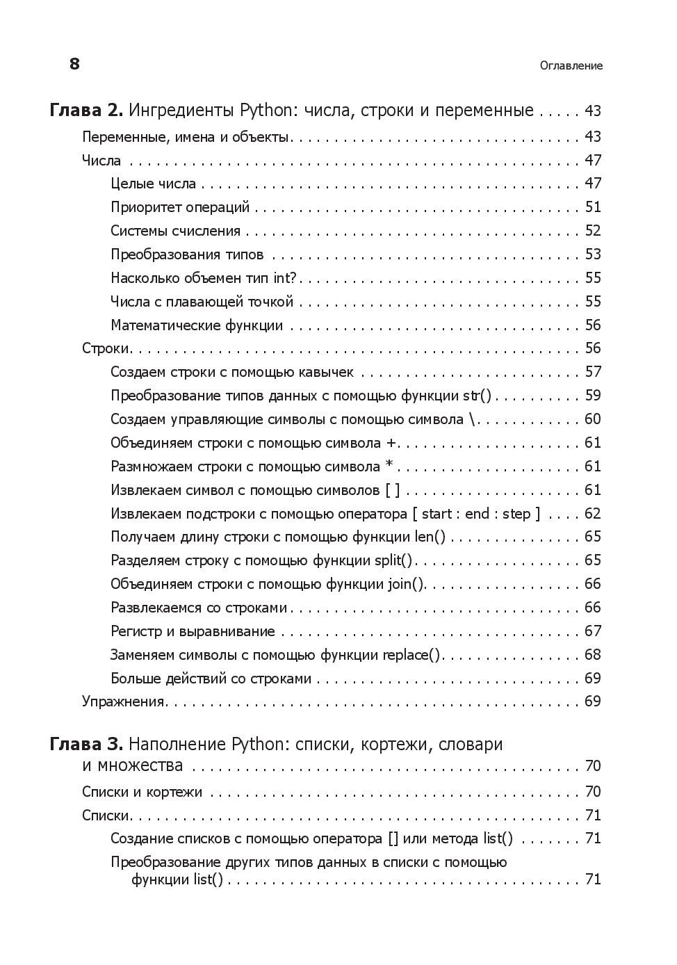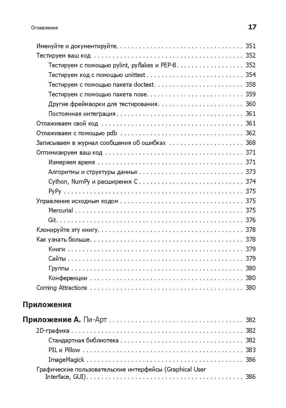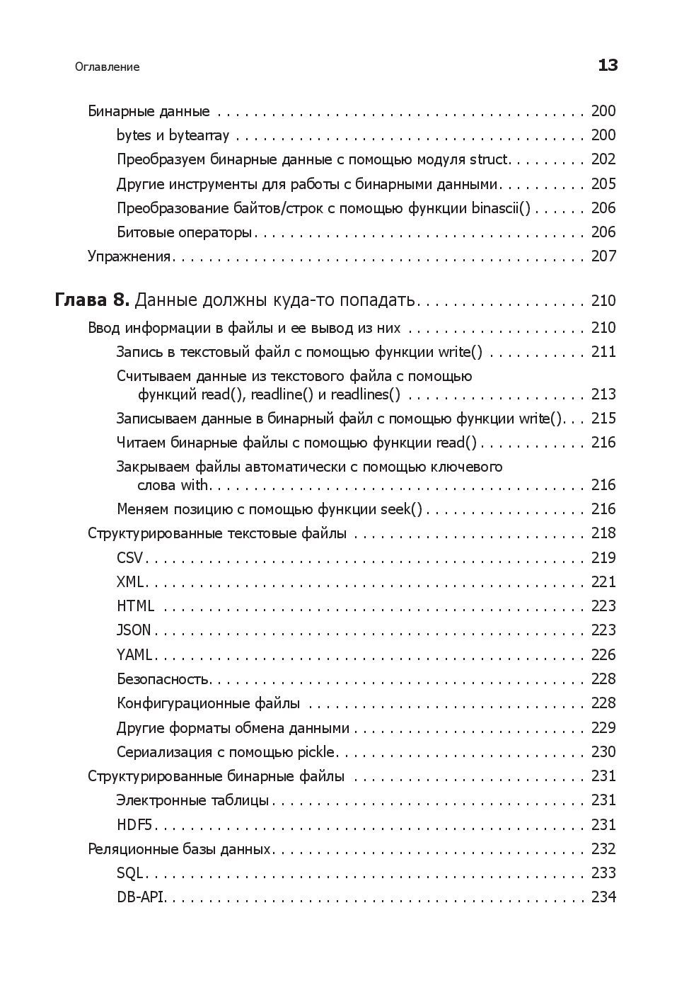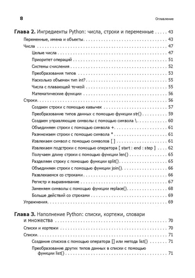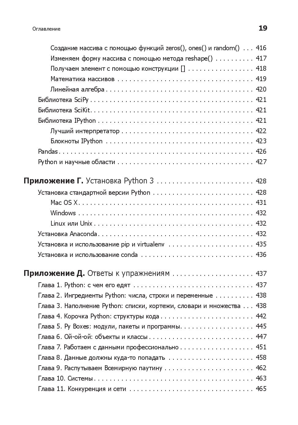 Любому программисту нужно знать не только язык, но и его возможности. Вы начнете с основ Python и его стандартной библиотеки. Узнаете, как находить, загружать, устанавливать и использовать сторонние пакеты. Изучите лучшие практики тестирования, отладки, повторного использования кода и получите полезные советы по разработке. Примеры кода и упражнения помогут в создании приложений для различных целей. Что изменилось? - Абсолютно новые 100 страниц (там есть котики). - Глав стало большое, но они стали короче. - Появилась глава, посвященная типам данных, переменным и именам. - Добавился рассказ о новых возможностях Python, таких как f-строки. - Обновилась информация о сторонних библиотеках. - Новые примеры кода. - Дан обзор библиотеки asyncio. - Рассмотрен новый стек технологий: контейнеры, облачные технологии, data science и машинное обучение. Что осталось неизменным? - Примеры c утками и плохими стихотворениями. Они навечно с нами.