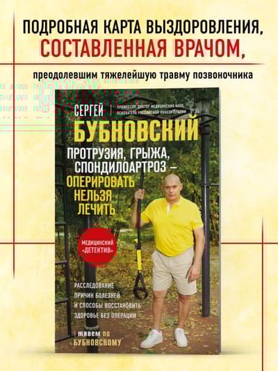 Новая книга доктора посвящена протрузиям и грыжам — самой частой причине обращения к хирургам среди пациентов в возрасте 35+. Книга профессора Бубновского — это иллюстрированное пособие для тех, кто уже знаком с его уникальной запатентованной методикой лечения и оздоровления позвоночника и суставов, известной под названием «кинезитерапия».