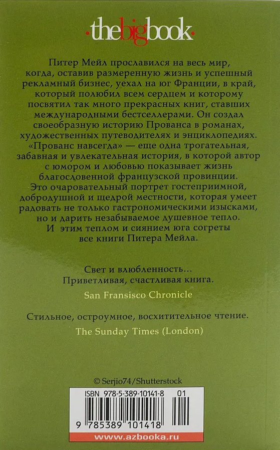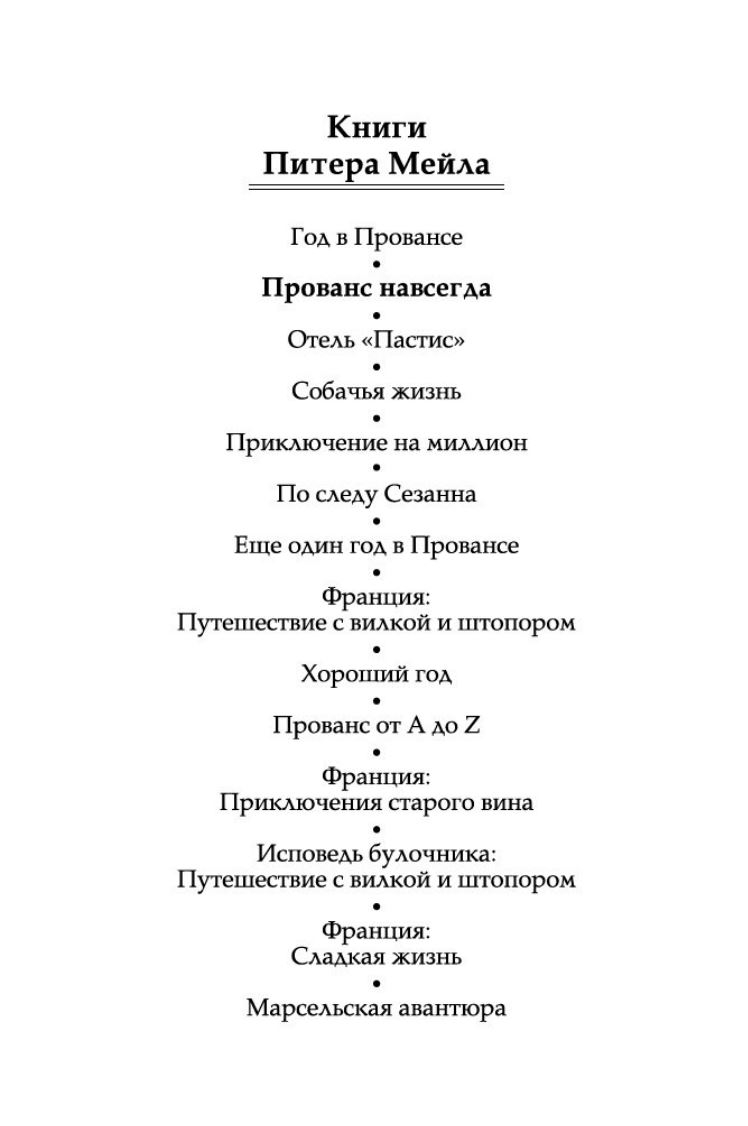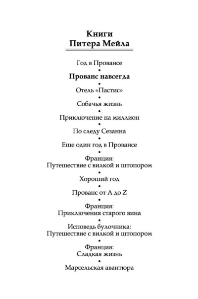 Питер Мейл прославился на весь мир, когда, оставив размеренную жизнь и успешный рекламный бизнес, уехал на юг Франции, в край, который полюбил всем сердцем и которому посвятил так много прекрасных книг, ставших международными бестселлерами. Он создал своеобразную историю Прованса в романах, художественных путеводителях и энциклопедиях. «Прованс навсегда» - еще одна трогательная, забавная и увлекательная история, в которой автор с юмором и любовью показывает жизнь благословенной французской провинции. Это очаровательный портрет гостеприимной, добродушной и щедрой местности, которая умеет радовать не только гастрономическими изысками, но и дарить незабываемое душевное тепло. И этим теплом и сиянием юга согреты все книги Питера Мейла.