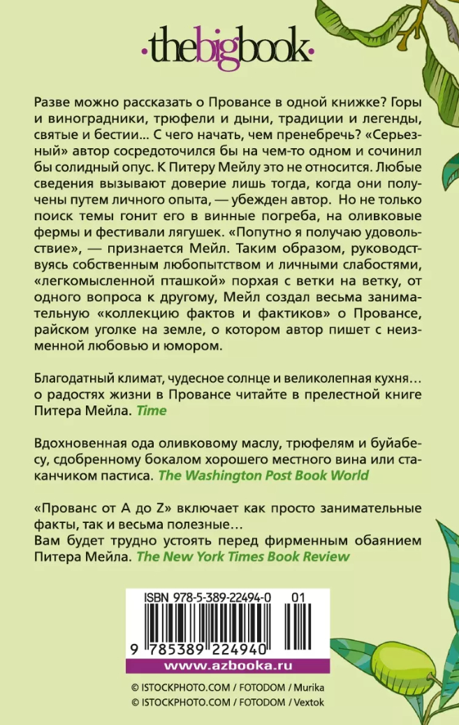 Разве можно рассказать о Провансе в одной книжке? Горы и виноградники, трюфели и дыни, традиции и легенды, святые и бестии... С чего начать, чем пренебречь? «Серьезный» автор сосредоточился бы на чем-то одном и сочинил бы солидный опус. К Питеру Мейлу это не относится. Любые сведения вызывают доверие лишь тогда, когда они получены путем личного опыта, — убежден автор. Но не только поиск темы гонит его в винные погреба, на оливковые фермы и фестивали лягушек. «Попутно я получаю удовольствие», — признается Мейл. Таким образом, руководствуясь собственным любопытством и личными слабостями, «легкомысленной пташкой» порхая с ветки на ветку, от одного вопроса к другому, Мейл создал весьма занимательную «коллекцию фактов и фактиков» о Провансе, райском уголке на земле, о котором автор пишет с неизменной любовью и юмором.