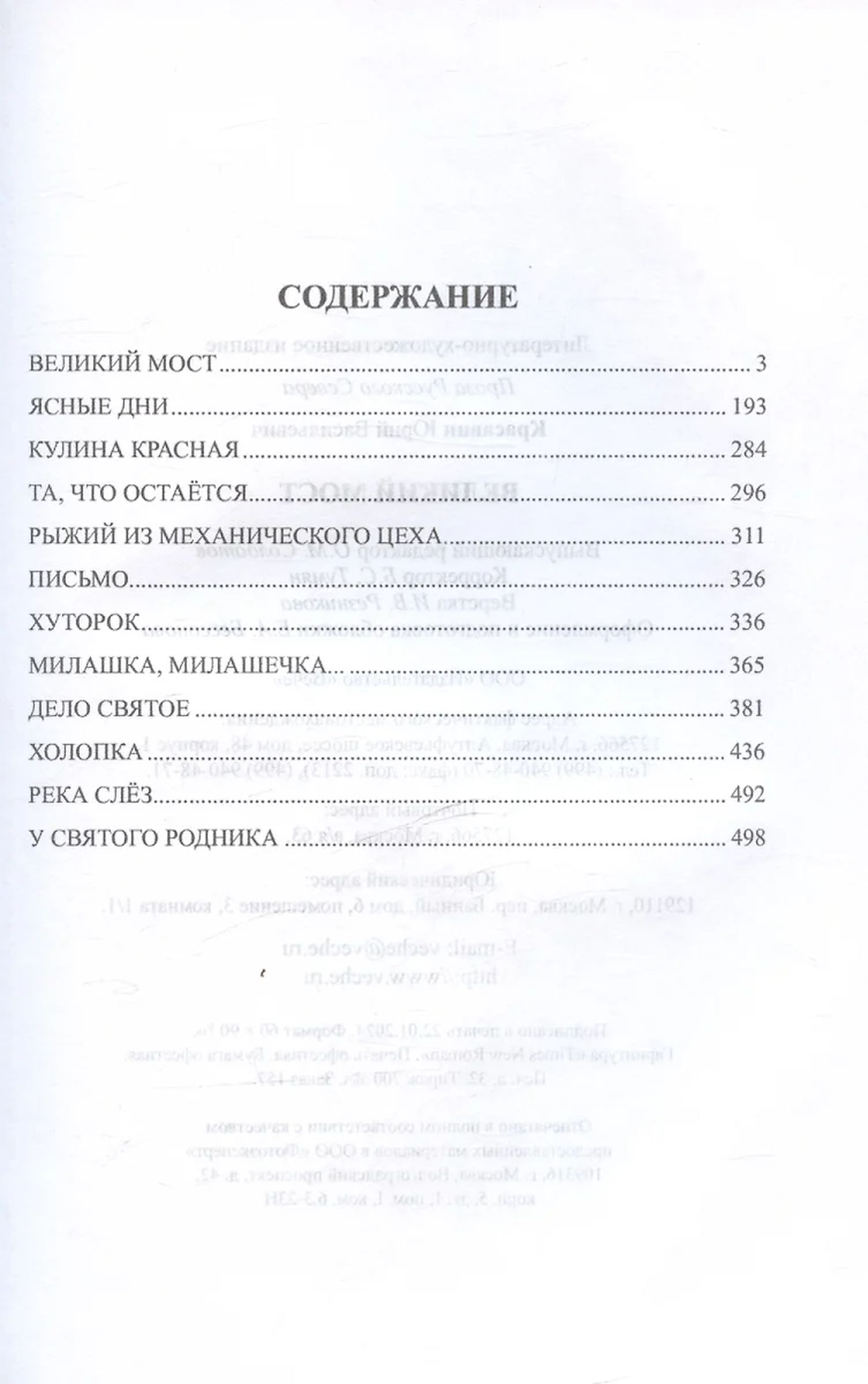 В новый сборник известного русского писателя Юрия Васильевича Красавина (1938—2013) вошли двенадцать произведений, объединенных широкой палитрой отношений между мужчиной и женщиной. Во все времена, что бы ни происходило вокруг, даже в эпоху войн и потрясений, эта тема волновала и главенствовала в мире. Роман «Великий мост», лирические повести и рассказы, написанные в изыскан­ной бунинской традиции, помогут читателю пережить знакомые или незнакомые робость и надежду, ревность и страсть, тревогу и счастье, как пережили их герои этой книги.