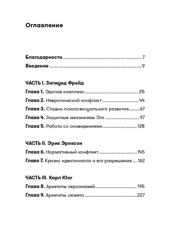 Работа над сценарием, как и всякое творчество, по большей части происходит по наитию, и многие профессионалы кинематографа считают, что художественная свобода и анализ несовместимы. Уильям Индик категорически с этим не согласен. Анализируя теории психоанализа — от Зигмунда Фрейда и Эрика Эриксона до Морин Мердок и Ролло Мэя, автор подкрепляет концепции знаменитых ученых примерами из известных фильмов с их вечными темами: любовь и секс, смерть и разрушение, страх и гнев, месть и ненависть. Рассматривая мотивы, подспудные желания, комплексы, движущие героями, Индик оценивает победы и просчеты авторов, которые в конечном счете нельзя скрыть от зрителя. Ведь зритель сопереживает герою, идентифицирует себя с ним, проходит вместе с ним путь трансформации и достигает катарсиса.