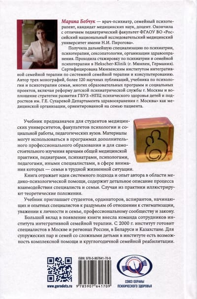 Книга отражает идеи системного подхода и опыт автора в области медикопсихологической помощи, содержит детальное описание процесса взаимодействия специалиста и семьи. Случаи из практики иллюстрируют теоретические положения. Учебник приглашает студентов, ординаторов, аспирантов, начинающих и опытных специалистов к раздумьям об отношении к стигматизации,уважении к личности и семье, профессиональному сообществу и закону.