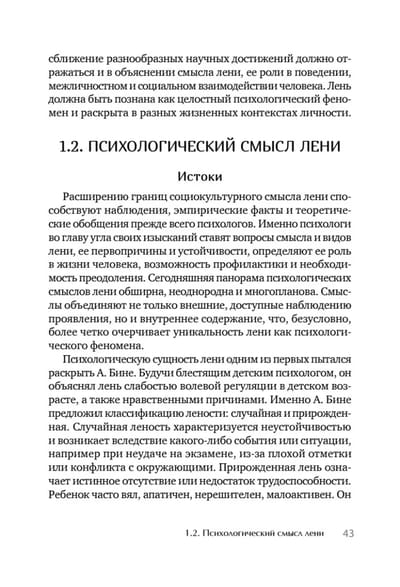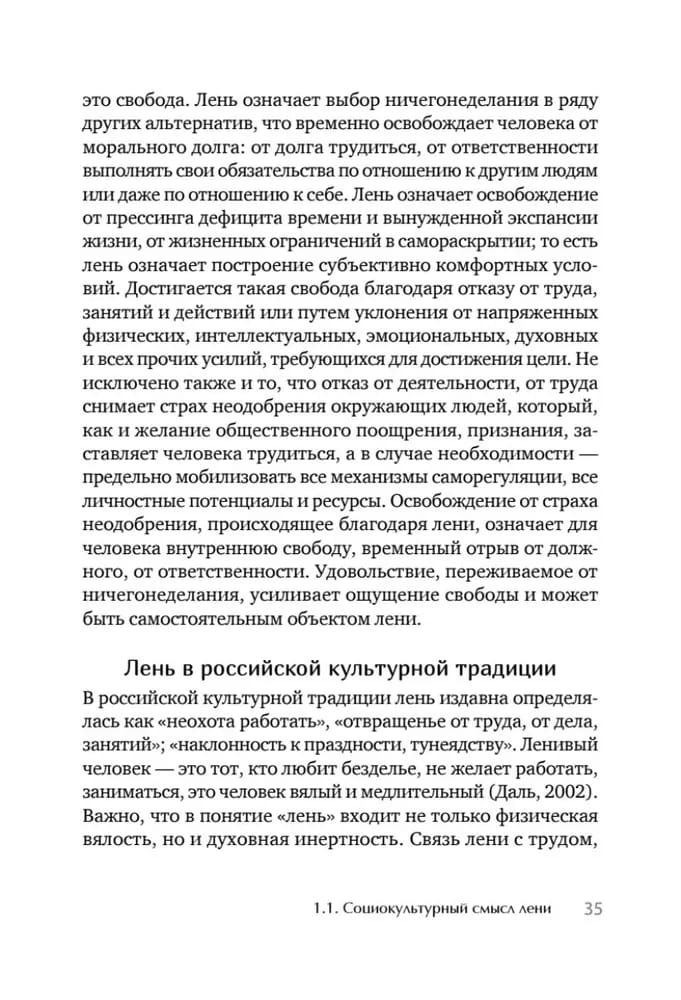 Книга объединяет культурно­исторический, психологический и эмпирический анализ лени во всех значимых жизненных контекстах личности. Лень представлена в смысловом контексте, в контексте активности, социальных пра­ вил поведения и личностной саморегуляции. Во всех случаях лень проявляется как ограничение активности, вызванное желанием ничего не делать. Автором раскрыты разные виды лени, сочетающие в себе отказ от деятельности, получение удовольствия и личностную саморегуляцию: гедонистическая, ангедонистическая, ситуативная, личностно регулируемая, труднопреодолеваемая, преодолеваемая развлечениями.