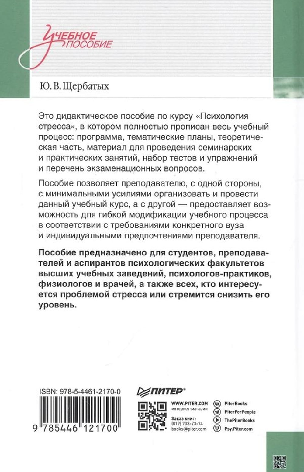 Это дидактическое пособие по курсу «Психология стресса», в котором полностью прописан весь учебный процесс: программа, тематические планы, теоретическая часть, материал для проведения семинарских и практических занятий, набор тестов и упражнений и перечень экзаменационных вопросов. Пособие позволяет преподавателю, с одной стороны, с минимальными усилиями организовать и провести данный учебный курс, а с другой – предоставляет возможность для гибкой модификации учебного процесса в соответствии с требованиями конкретного ВУЗа и индивидуальными предпочтениями преподавателя. Пособие предназначено для студентов, преподавателей и аспирантов психологических факультетов высших учебных заведений, психологов-практиков, физиологов и врачей, а также всем тем, кто интересуется проблемой стресса или стремится снизить его уровень.