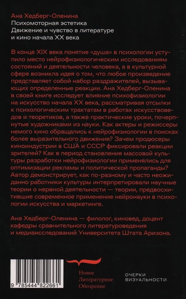 В конце ХIX века понятие «душа» в психологии уступило место нейрофизиологическим исследованиям состояний и деятельности человека, а в культурной сфере возникла идея о том, что любое произведение представляет собой набор раздражителей, вызывающих определенные реакции. Ана Хедберг-Оленина в своей книге исследует влияние психофизиологии на искусство начала ХX века, рассматривая отсылки к психологическим трактатам в работах искусствоведов и теоретиков, а также практические уроки, почерпнутые художниками из науки.