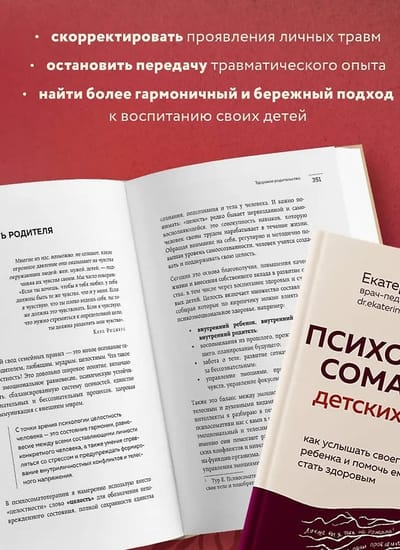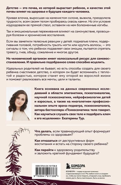 Екатерина Тур — врач, психосоматолог и специалист по телесно-ориентированной терапии. В этой книге она рассказывает, как детский травмирующий опыт влияет на мозг и тело, как появляются психосоматические нарушения и к каким ментальным и физическим проблемам у ребенка это приводит. Чем опасны крик, наказания и отстраненное поведение? Какие заболевания связаны с психосоматикой? Как быть целостным и осознанным родителем и почему это так важно? Автор включила в книгу упражнения и практики, которые помогут проработать собственный болезненный опыт и страхи. «Детская психосоматика» — книга о безусловной любви, понимании и доверии и о том, как создать для своего ребенка по-настоящему счастливое детство. Книга основана на современных исследованиях в области эпигенетики, нейрофизиологии детей и взрослых, научной психосоматики.