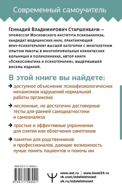 Этот краткий курс самопомощи — незаменимый помощник в психотерапии для врачей, пациентов и их родственников — создал признанный эксперт в области психосоматических болезней, известный психотерапевт Г. В. Старшенбаум.