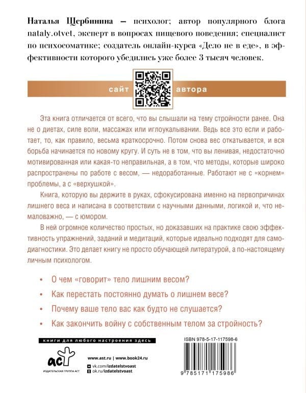 Эта книга отличается от всего, что вы слышали на тему стройности ранее. Она не о диетах, силе воли, массажах или иглоукалывании. Ведь все это если и работает, то, как правило, весьма краткосрочно. Потом снова вес откатывается, и вся борьба начинается по новому кругу. И суть не в том, что вы ленивая, недостаточно мотивированная или какая-то неправильная, а в том, что методы, которые широко распространены по работе с весом, — недоработанные. Работают не с «корнем» проблемы, а с «верхушкой».