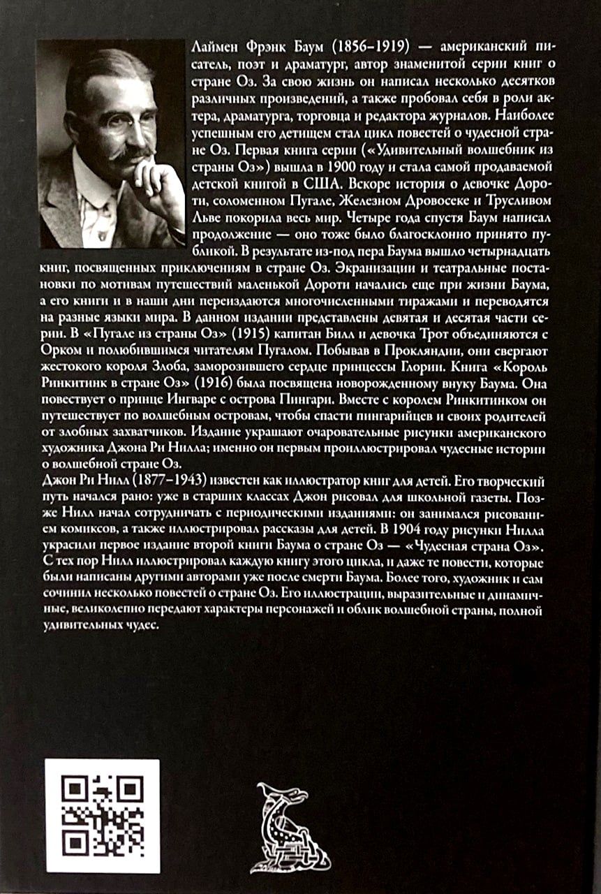Вскоре история о девочке Дороти, соломенном Пугале, Железном Дровосеке и Трусливом Льве покорила весь мир. Четыре года спустя Баум написал продолжение — оно тоже было благосклонно принято публикой. В результате из-под пера Баума вышло четырнадцать книг, посвященных приключениям в стране Оз. Экранизации и театральные постановки по мотивам путешествий маленькой Дороти начались еще при жизни Баума, а его книги и в наши дни переиздаются многочисленными тиражами и переводятся на разные языки мира. В данном издании представлены девятая и десятая части серии.