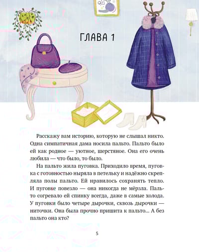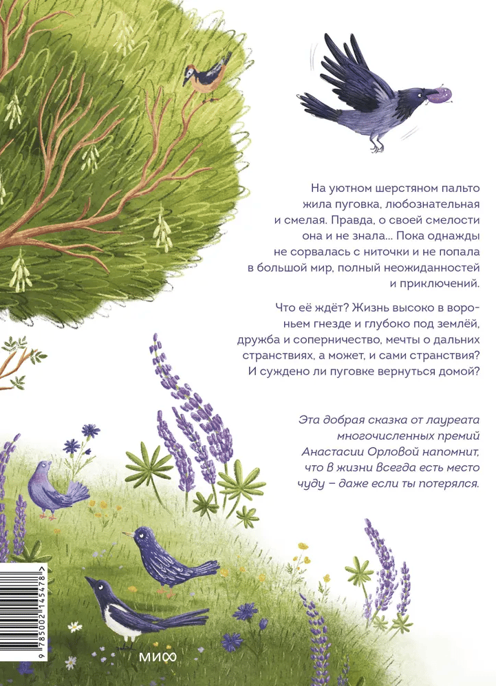 Добрая волшебная сказка от автора-лауреата многочисленных литературных премий Анастасии Орловой. Расскажу вам историю, которую не слышал никто. Одна симпатичная дама носила пальто. Пальто было ей как родное — уютное, шерстяное. Она его очень любила — что было, то было. На пальто жила пуговка… Так начинается удивительная история пуговки Лиллы, которая сорвалась с ниточки и попала в большой мир, полный неожиданностей и приключений. Что ее ждет? Жизнь в вороньем гнезде и мышиной норке, дружба и соперничество, мечты о дальних странствиях… и, конечно, возвращение домой к любимой хозяйке. Эта уютная история понравится поклонникам Г. Х. Андерсена, подарит надежду и напомнит, что в жизни всегда есть место чуду — даже если ты потерялся.