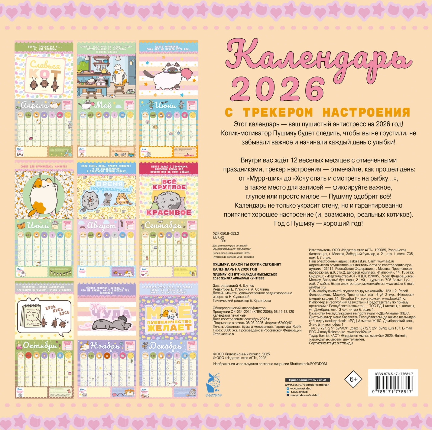 Внутри вас ждёт 12 веселых месяцев с отмеченными праздниками, трекер настроения – отмечайте, как прошел день: от «Мурр-шик» до «Хочу спать и смотреть на рыбку…», а также место для записей – фиксируйте важное, глупое или просто милое – Пушмяу одобрит всё! Календарь не только украсит стену, но и гарантированно притянет хорошее настроение (и, возможно, реальных котиков).