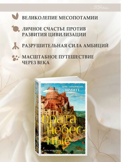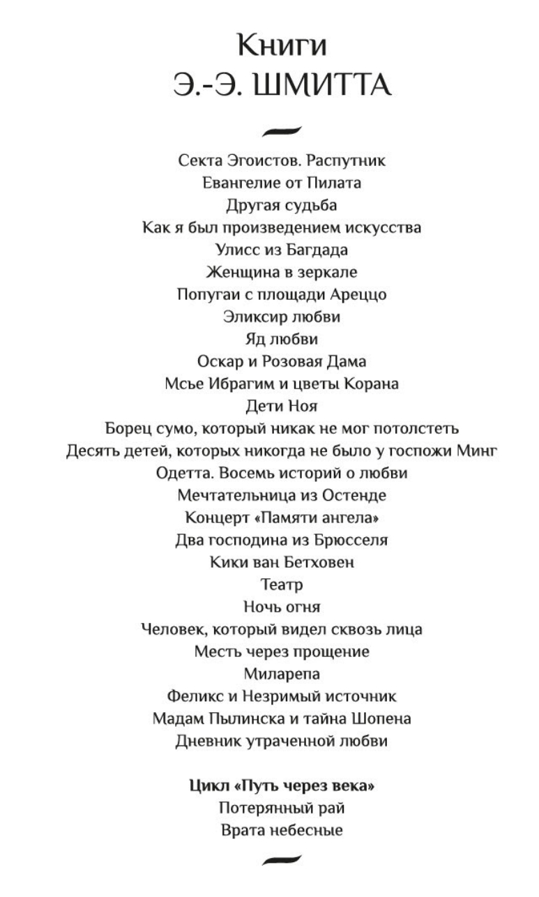 Эрик-Эмманюэль Шмитт — мировая знаменитость, лауреат Гонкуровской премии и многих других наград. Его роман «Оскар и Розовая Дама» читатели назвали книгой, изменившей их жизнь, наряду с Библией, «Маленьким принцем» и «Тремя мушкетерами». Его романы переведены на 45 языков и во Франции каждый год выходят общим тиражом полмиллиона экземпляров. «Врата небесные» — второй том грандиозной философско-романтической саги Шмитта «Путь через века».