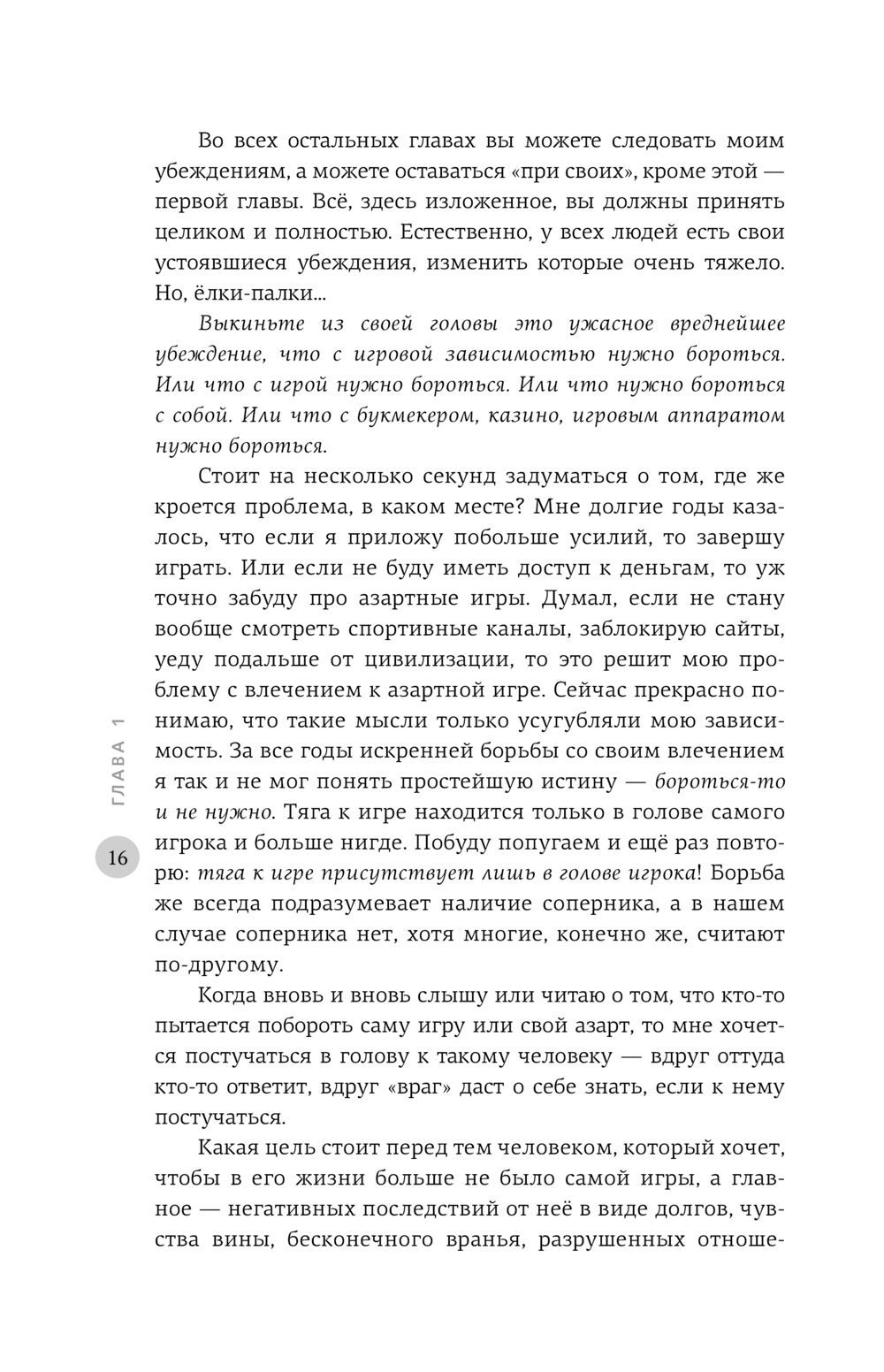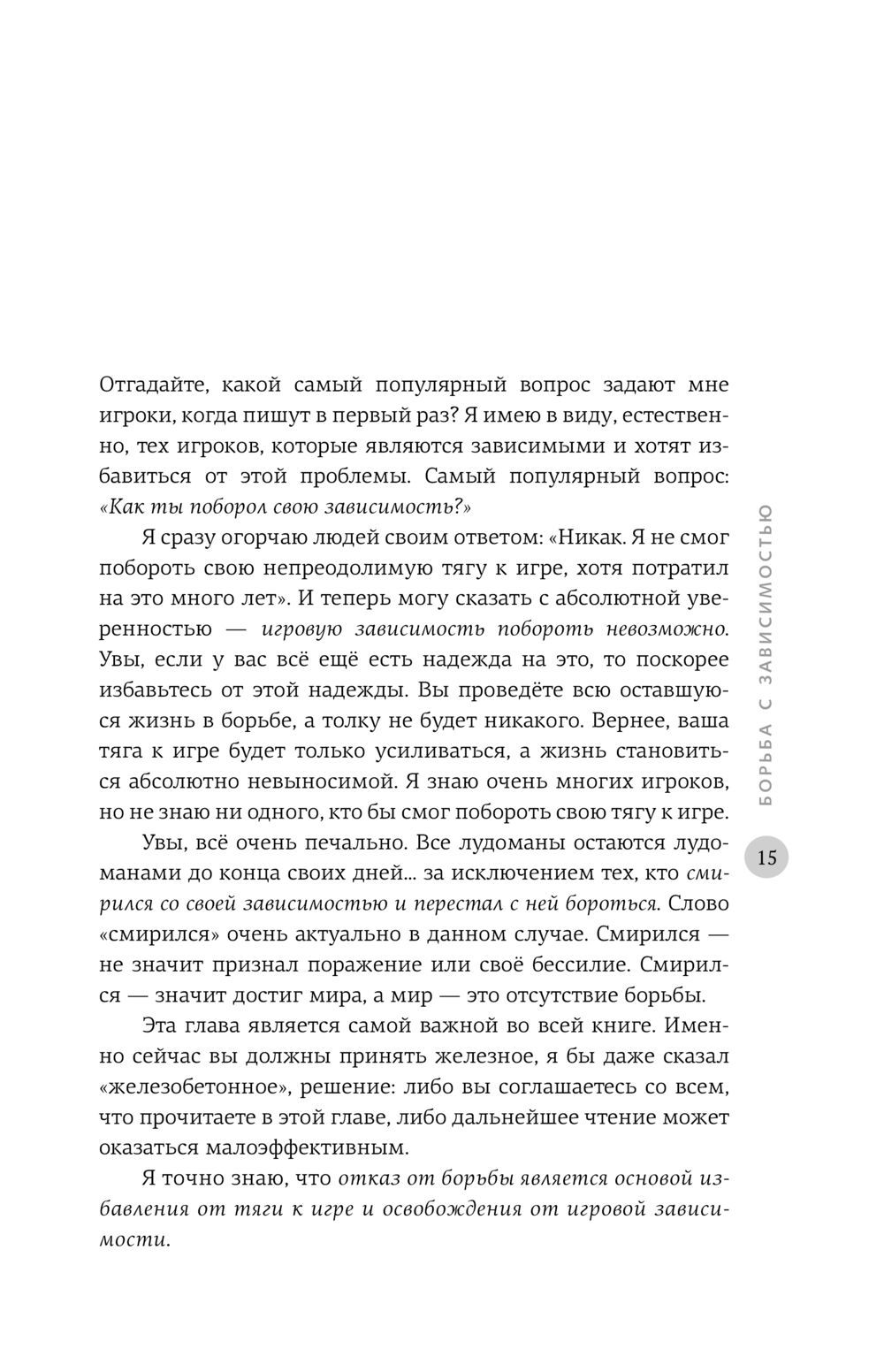 Эта книга — ваш личный помощник на пути к освобождению от игровой зависимости и изменению жизни в целом. Вы не найдёте в ней банальных вещей вроде тестов, определяющих степень тяжести вашей зависимости, или волшебных «врачебных» методик. Только полезные рекомендации, которые помогут вам изменить мышление и стать абсолютно равнодушным к азартной игре человеком.
