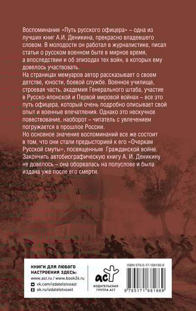 Воспоминания «Путь русского офицера» – одна из лучших книг А. И. Деникина, прекрасно владевшего словом. В молодости он работал в журналистике, писал статьи о русском военном быте в мирное время, а впоследствии – и об эпизодах тех войн, в которых ему довелось участвовать.