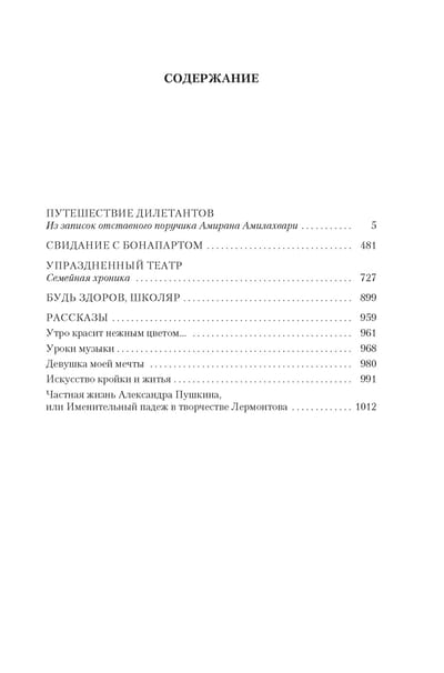 Булат Шалвович Окуджава (1924–1997) широкую известность получил как автор песен, бард, поэт. Но он писал также замечательную прозу: «исторические фантазии» из XIX века и автобиографические произведения. Его прозаические тексты тоже музыкальны: множество голосов, каждый из которых звучит на свой лад, сплетаются в единую художественную ткань, чудесно преображая в искусство исторические факты и строчки биографий. Пожалуй, важнейшая тема всего творчества Окуджавы — человеческое достоинство. С горечью он констатировал: «Мы по-прежнему не умеем уважать человеческую личность, не умеем видеть в ней высшую ценность жизни». Этот мотив проходит красной нитью через все его работы. В книгу включены наиболее значимые романы Окуджавы, созданные на материале XIX века: «Путешествие дилетантов» (1971–1977, опубл. 1976–1978), «Свидание с Бонапартом» (1983, его автор не раз называл своим лучшим произведением), а также автобиографический роман «Упраздненный театр» (1989–1993; удостоен Букеровской премии в 1994 году), дополненный автобиографическими же рассказами. Ранняя повесть «Будь здоров, школяр» (1961), также вошедшая в сборник, — «это не приключения. Это о том, как я воевал. Как меня убить хотели, но мне повезло»…