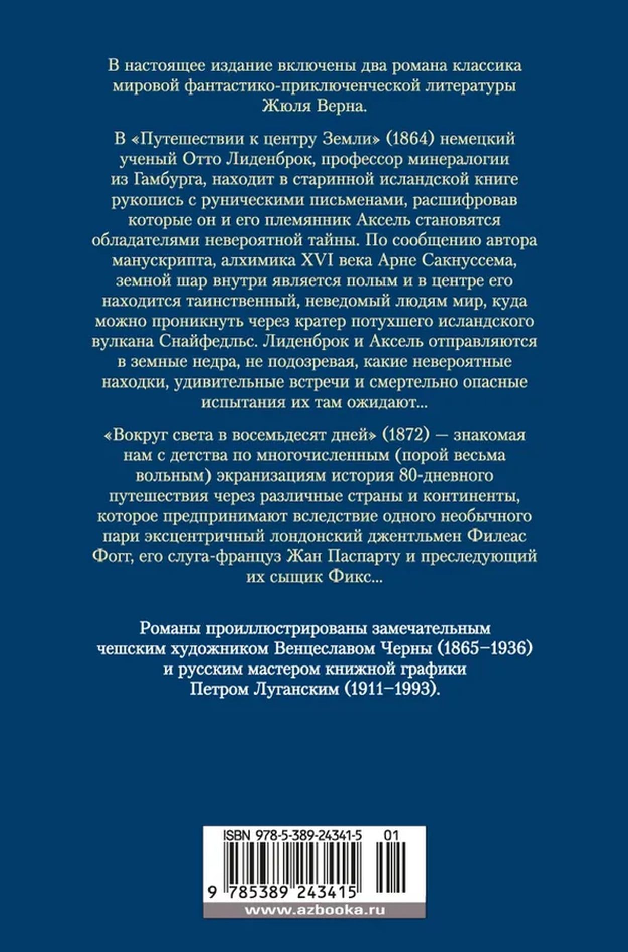 В настоящее издание включены два романа классика мировой фантастико-приключенческой литературы Жюля Верна. В «Путешествии к центру Земли» (1864) немецкий ученый Отто Лиденброк, профессор минералогии из Гамбурга, находит в старинной исландской книге рукопись с руническими письменами, расшифровав которые он и его племянник Аксель становятся обладателями невероятной тайны. По сообщению автора манускрипта, алхимика XVI века Арне Сакнуссема, земной шар внутри является полым и в центре его находится таинственный, неведомый людям мир, куда можно проникнуть через кратер потухшего исландского вулкана Снайфедльс. Лиденброк и Аксель отправляются в земные недра, не подозревая, какие невероятные находки, удивительные встречи и смертельно опасные испытания их там ожидают… «Вокруг света в восемьдесят дней» (1872) — знакомая нам с детства по многочисленным (порой весьма вольным) экранизациям история 80-дневного путешествия через различные страны и континенты, которое предпринимают вследствие одного необычного пари эксцентричный лондонский джентльмен Филеас Фогг, его слуга-француз Жан Паспарту и преследующий их сыщик Фикс… В настоящем издании романы проиллюстрированы замечательным чешским художником Венцеславом Черны (1865–1936) и русским мастером книжной графики Петром Луганским (1911–1993).