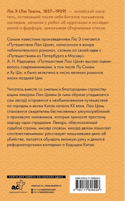 Читатель вместе со смелым и благородным странствующим лекарем Лао Цанем (в чьём образе угадывается сам автор) отправится в необыкновенное путешествие по городам и весям Китая начала XX века. Лао Цань становится свидетелем бесчисленных злоупотреблений и произвола чиновников, которые приносят простому народу одни страдания. Лекарь, обеспокоенный судьбой страны, иногда словом, иногда делом помогает соотечественникам: расследует нашумевшее дело об убийстве, пытается обуздать великую реку и делится реформаторскими взглядами о будущем Китая.