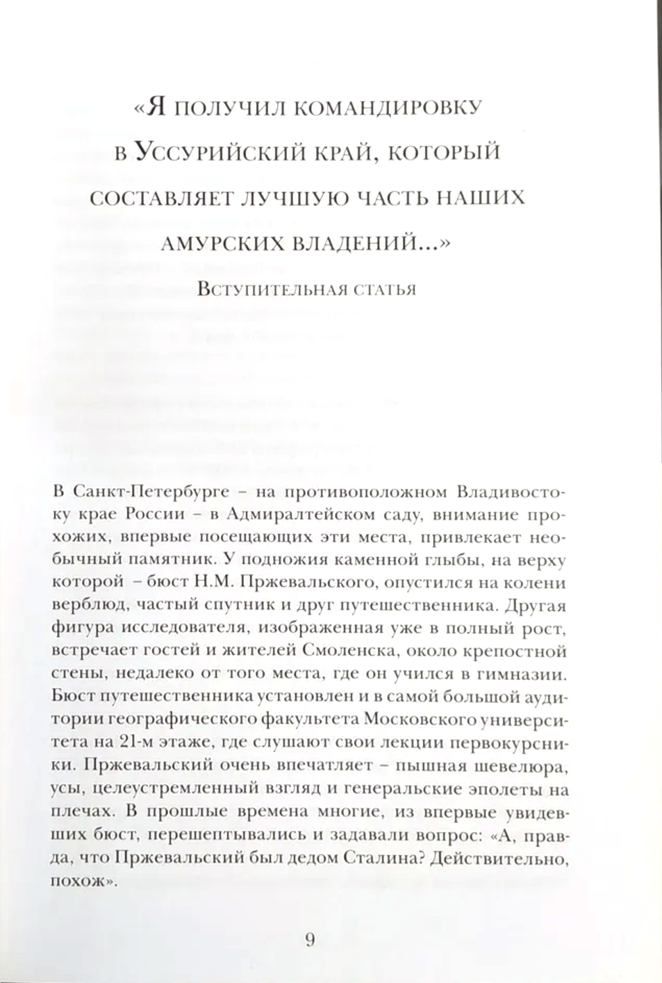 Самая первая и, вместе с тем, наиболее известная и читаемая книга «Путешествие в Уссурийском крае. 1867-1869 гг.» великого российского путешественника и исследователя Николая Михайловича Пржевальского (1839-1888) издается в полной авторской редакции, по первому изданию 1870 года, которое было отпечатано в Санкт-Петербурге в типографии Н. Неклюдова, на деньги автора.