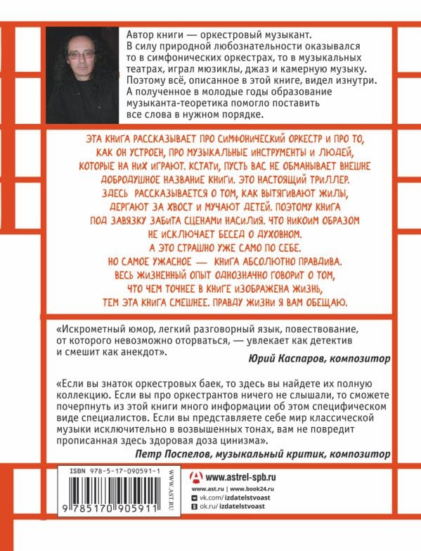 Эта книга рассказывает про симфонический оркестр и про то, как он устроен, про музыкальные инструменты и людей, которые на них играют. И про тех, кто на них не играет, тоже. Кстати, пусть вас не обманывает внешне добродушное название книги. Это настоящий триллер. Здесь рассказывается о том, как вытягивают жилы, дергают за хвост, натягивают шкуру на котел и мучают детей. Да и взрослых тоже. Поэтому книга под завязку забита сценами насилия. Что никоим образом не исключает бесед о духовном. А это страшно уже само по себе. Но самое ужасное — книга абсолютно правдива. Весь жизненный опыт однозначно и бескомпромиссно говорит о том, что чем точнее в книге изображена жизнь, тем эта книга смешнее. Правду жизни я вам обещаю.