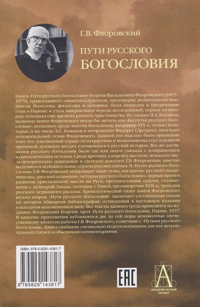 Книга «Пути русскою богословия» Георгия Васильевича Флоровского (1893— 1979), православного священнослужителя, протоиерея; религиозного мыслителя, богослова, философа и историка, была написана в предвоенные годы в Париже и стала завершением череды исследований, первые из которых освещали еще времена раннего христианства. По словам Н.А. Бердяева, название книги Флоровского могло бы звучать как «Беспутья русского богословия», поскольку среди многих богословов, например XIX в., только некоторые, в их числе А.С. Хомяков и митрополит Филарет (Дроздов), получают положительный отзыв Флоровского. Главной его мыслью было признание того, что «умственный отрыв» от патристики и византинизма стал основной причиной духовных неудач, случавшихся в русской истории. Все же достижения русского богословия были так или иначе связаны с возвращением к святоотеческим истокам. Среди критики, а порой и жесткой, немалого числа исторических церковных и светских деятелей Г.В. Флоровским заметно выделяются положительные образы русских святых.
