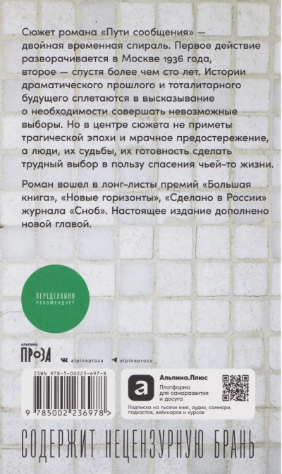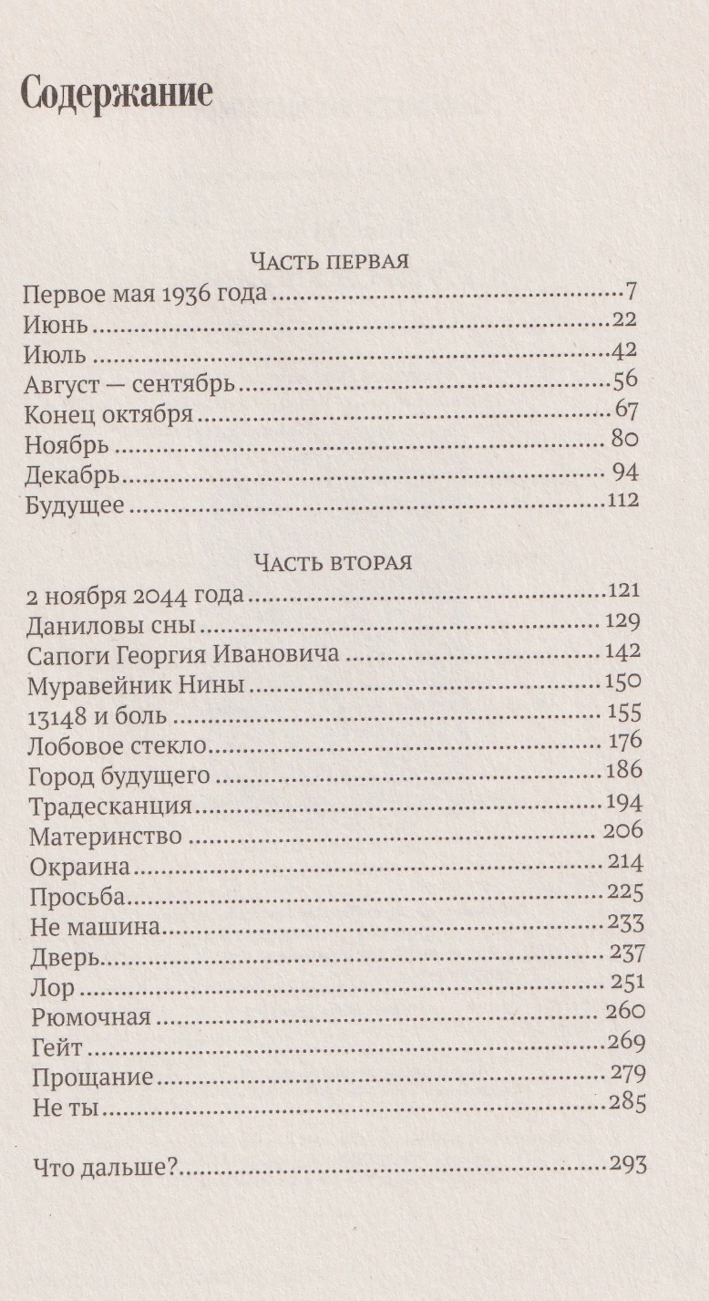 Сюжет романа — двойная временная спираль. Первое действие разворачивается в Москве 1936 года, второе — спустя более чем сто лет. Истории драматического прошлого и тоталитарного будущего сплетаются в высказывание о необходимости совершать невозможные выборы. Но в центре сюжета не приметы трагической эпохи и мрачное предостережение, а люди, их судьбы, их готовность сделать трудный выбор в пользу спасения чьей-то жизни.