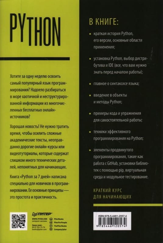 Хорошая новость! Не нужно тратить время, чтобы осилить сложные академические тексты, неоправданно дорогие онлайн-курсы или видеотуториалы, которые содержат слишком много технических деталей, непонятных для начинающих. Книга «Python за 7 дней» написана специально для новичков в программировании. Ее основные принципы – это простота и практичность Вы познакомитесь с кратким введением в Python, чтобы понять какую пользу можно извлечь, изучая его; узнаете как установить Python и какой дистрибутив лучше использовать; разберетесь с объектами и методами (включая ООП), чтобы эффективно использовать этот удобный язык и его простой синтаксис. Практические упражнения в конце каждой главы идеально подойдут для отработки навыков программирования.