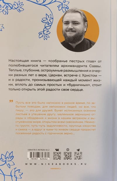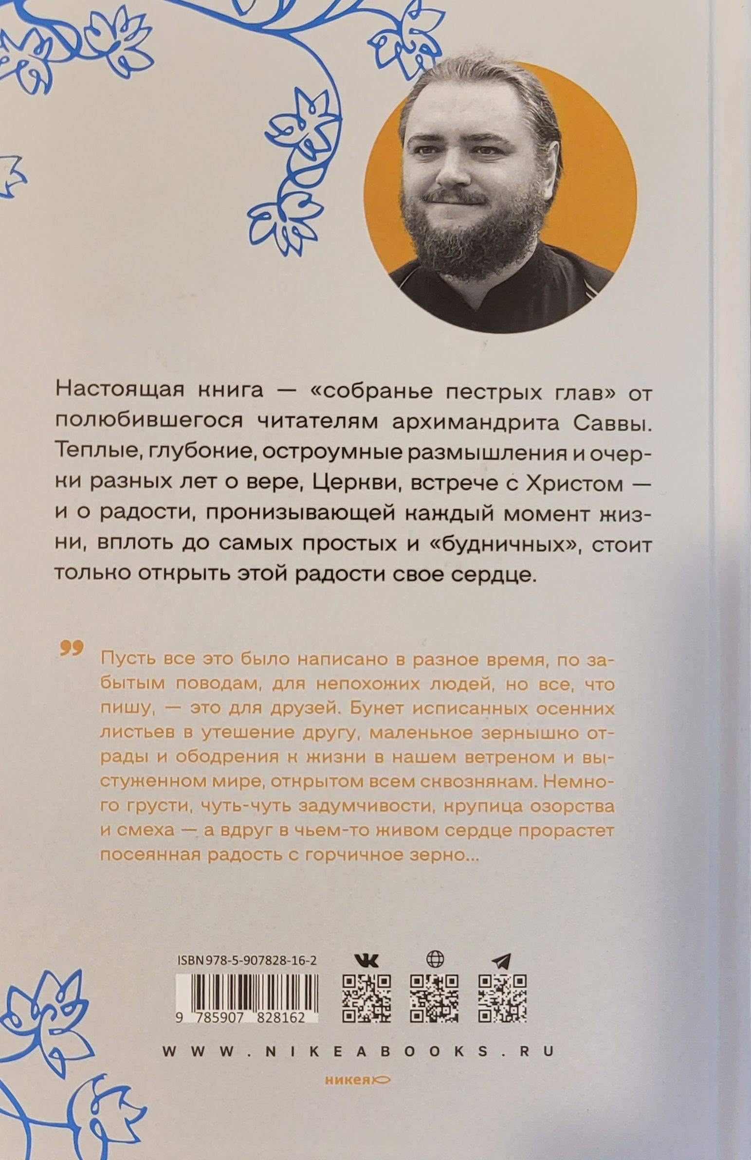 Настоящая книга — «собранье пестрых глав» от полюбившегося читателям архимандрита Саввы. Теплые, глубокие, остроумные размышления и очерки разных лет о вере, Церкви, встрече с Христом — и о радости, пронизывающей каждый момент жизни, вплоть до самых простых и «будничных», стоит только открыть этой радости свое сердце.