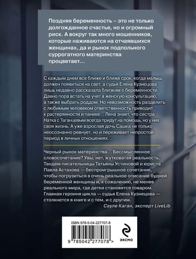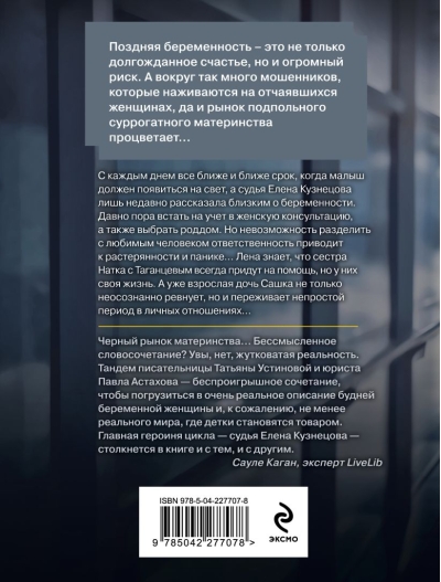 С каждым днем все ближе и ближе срок, когда малыш должен появиться на свет, а судья Елена Кузнецова лишь недавно рассказала близким о беременности. Давно пора встать на учет в женскую консультацию, а также выбрать роддом. Но невозможность разделить с любимым человеком ответственность приводит к растерянности и панике… Лена знает, что сестра Натка с Таганцевым всегда придут на помощь, но у них своя жизнь. А уже взрослая дочь Сашка не только неосознанно ревнует, но и переживает непростой период в личных отношениях…
