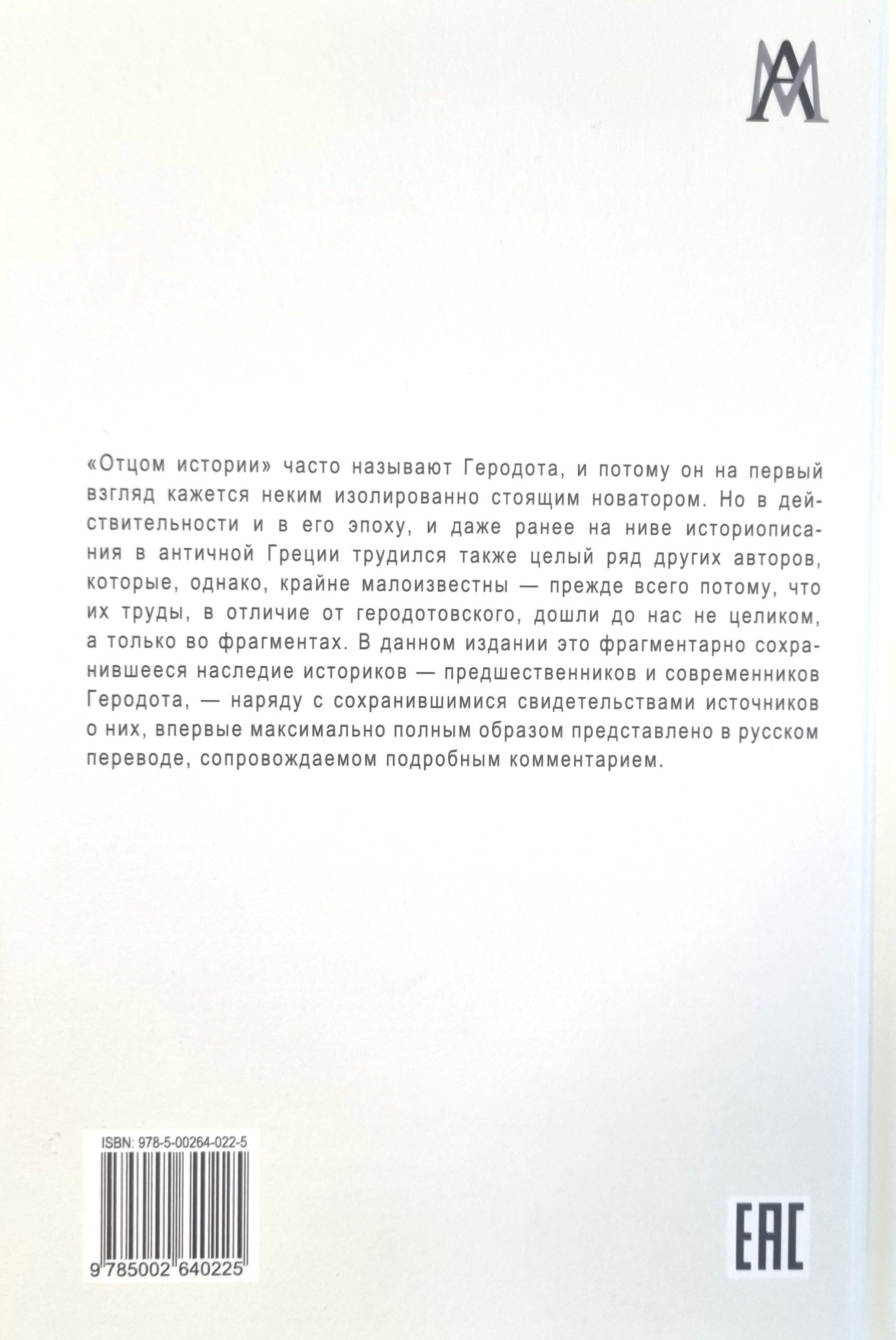 «Отцом истории» часто называют Геродота, и потому он на первый взгляд кажется неким изолированно стоящим новатором. Но в действительности и в его эпоху, и даже ранее на ниве историописания в античной Греции трудился также целый ряд других авторов, которые, однако, крайне малоизвестны — прежде всего потому, что их труды, в отличие от геродотовского, дошли до нас не целиком, а только во фрагментах. В данном издании это фрагментарно сохранившееся наследие историков — предшественников и современников Геродота, — наряду с сохранившимися свидетельствами источников о них, впервые максимально полным образом представлено в русском переводе, сопровождаемом подробным комментарием.