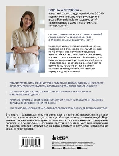 Элина Алтухова — мама четверых детей, первый профессиональный организатор пространства в странах Балтии, руководитель школы «Pure&Simple», известный блогер pureandsimple_org с аудиторией более 80 000 подписчиков по всему миру. Она создала простую и пошаговую систему порядка, которая рассчитана на реальных людей с реальными заботами и проблемами. С помощью этой методики уже более чем 9000 женщин из 48 стран мира навели порядок в своих домах. Если вы тоже хотите устроить в своей жизни «Расхламофон», настраивайтесь на волну позитива и наведите вместе с автором порядок в доме и в голове.