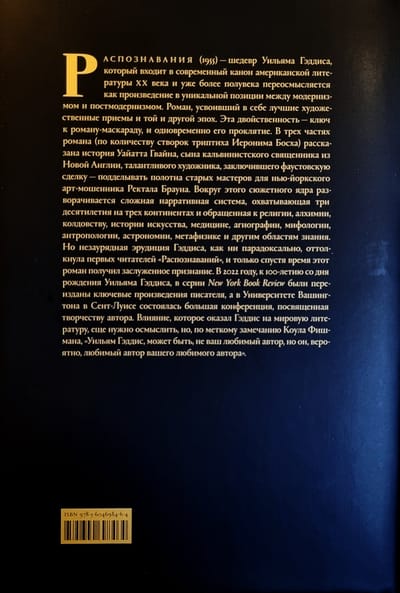 «Распознавания» (1955) — шедевр Уильяма Гэддиса, который входит в современный канон американской литературы XX века и уже более полувека переосмысляется как произведение в уникальной позиции между модернизмом и постмодернизмом. Роман, усвоивший в себе лучшие художественные приемы и той и другой эпох. Эта двойственность — ключ к роману-маскараду, и одновременно его проклятие. В трех частях романа (по количеству створок триптиха Иеронима Босха) рассказана история Уайатта Гвайна, сына кальвинистского священника из Новой Англии, талантливого художника, заключившего фаустовскую сделку — подделывать полотна старых мастеров для нью-йоркского арт-мошенника Ректала Брауна. Вокруг этого сюжетного ядра разворачивается сложная нарративная система, охватывающая три десятилетия на трех континентах и обращенная к религии, алхимии, колдовству, истории искусства, медицине, агиографии, мифологии, антропологии, астрономии, метафизике и другим областям знания. Но незаурядная эрудиция Гэддиса, как ни парадоксально, оттолкнула первых читателей «Распознаваний», и только спустя время этот роман получил заслуженное признание. В 2022 году, к 100-летию со дня рождения Уильяма Гэддиса, в серии New York Book Review были переизданы ключевые произведения писателя, а в Университете Вашингтона в Сент-Луисе состоялась большая конференция, посвященная творчеству автора. Влияние, которое оказал Гэддис на мировую литературу, еще нужно осмыслить, но, по меткому замечанию Коула Фишмана, «Уильям Гэддис, может быть, не ваш любимый автор, но он, вероятно, любимый автор вашего любимого автора».