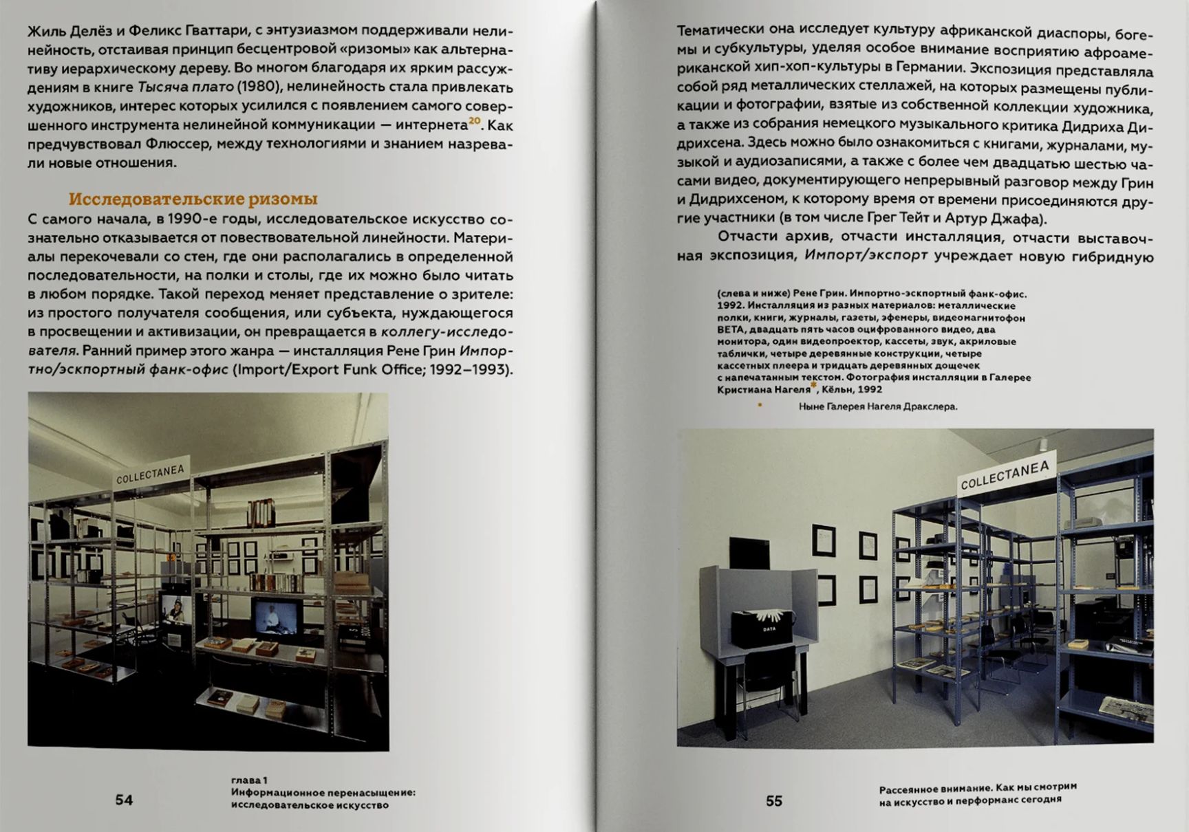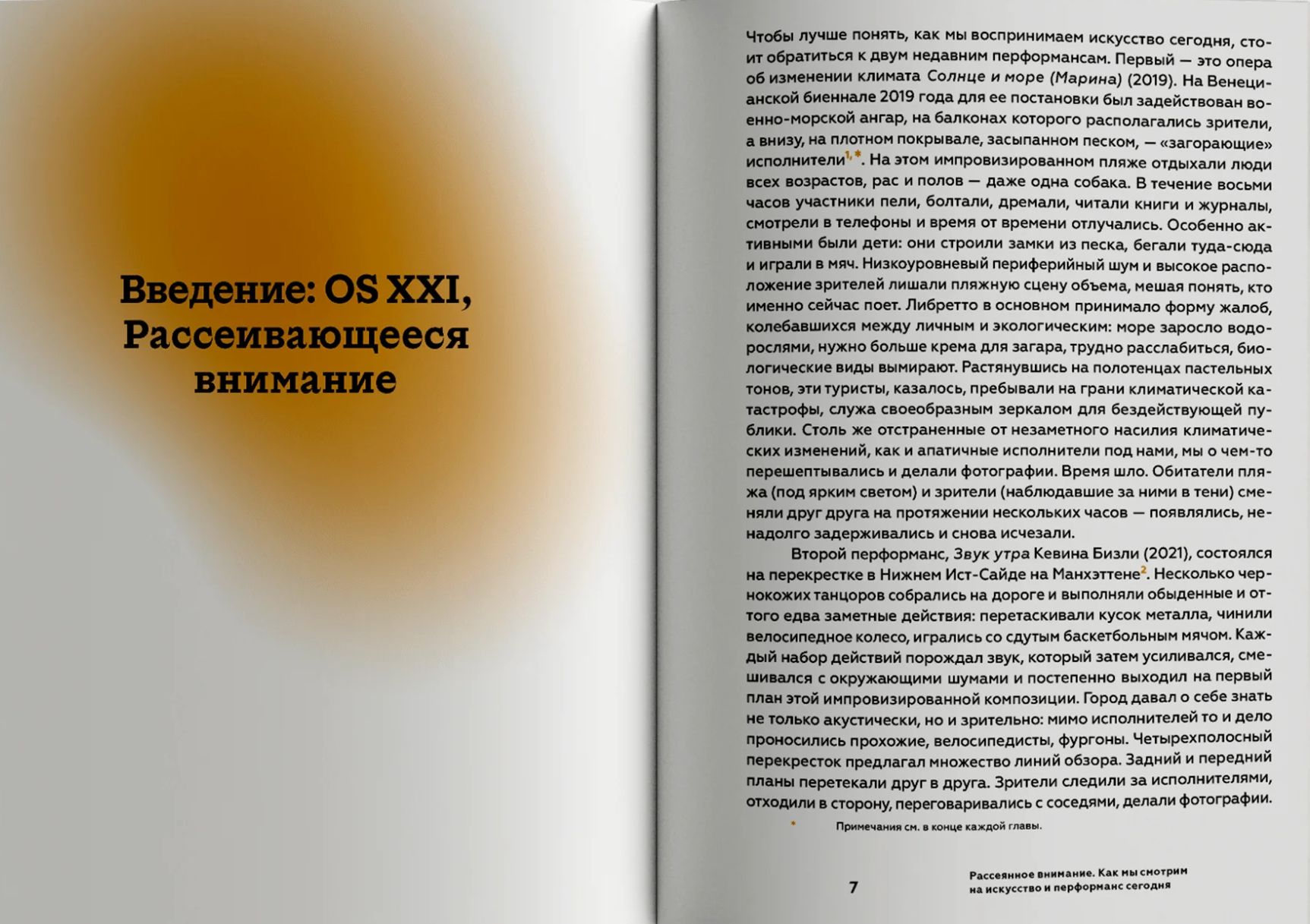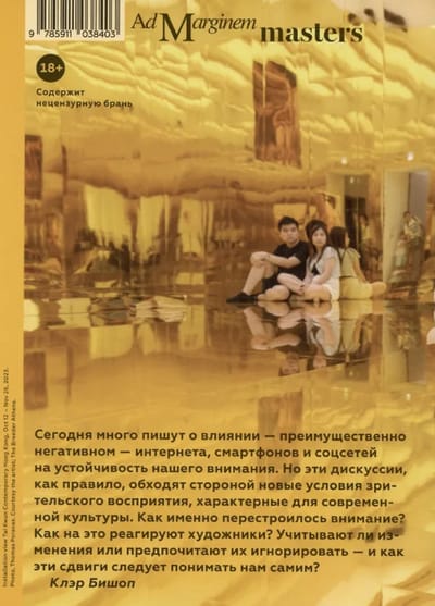 Клэр Бишоп (род. 1971) — британский искусствовед, куратор и профессор истории искусств в Городском университете Нью-Йорка, в поле исследовательского интереса которой находятся перформанс, инсталляция и «радикальная музеология» как основные медиумы современного искусства. Продолжая свои размышления в этих областях, она обращается к опыту зрителя, за внимание которого сегодня одновременно борются сложно устроенное искусство, неутихающий информационный поток и многозадачность современной жизни. Восприятие не предполагающих фиксированной точки зрения перформансов, проходящих на разных площадках, длящихся днями или, наоборот, всего пару минут, инсталляций с необозримым количеством архивного материала и т. д. смешивается с сообщениями в мессенджерах, уведомлениями, фото- и видеосъемкой для соцсетей, онлайн и офлайн обсуждением происходящего. Вместо недовольства по поводу «невозможности сосредоточиться» Бишоп предлагает принять эти условия как факт и осмыслить новую форму — рассеянного — зрительского внимания.