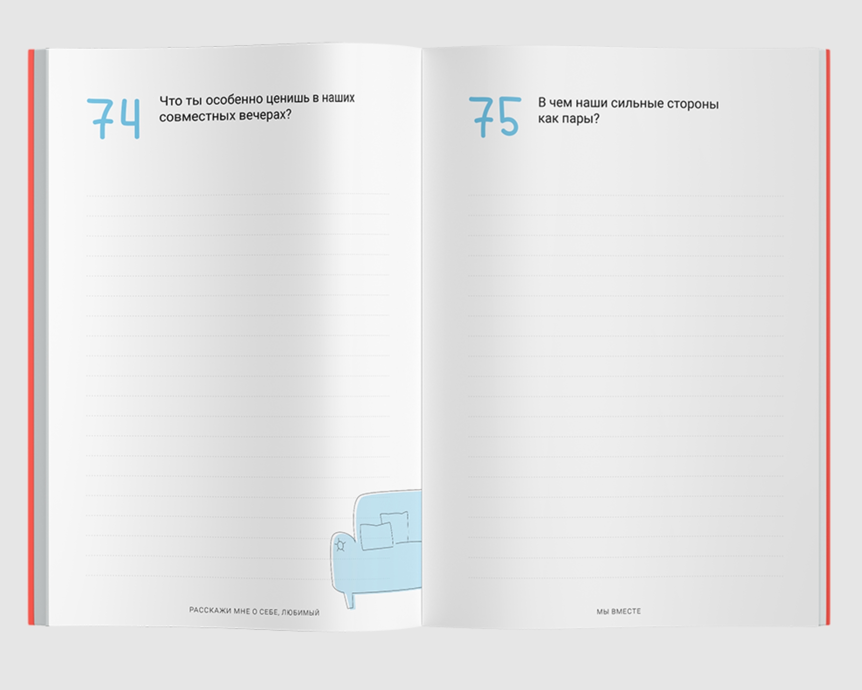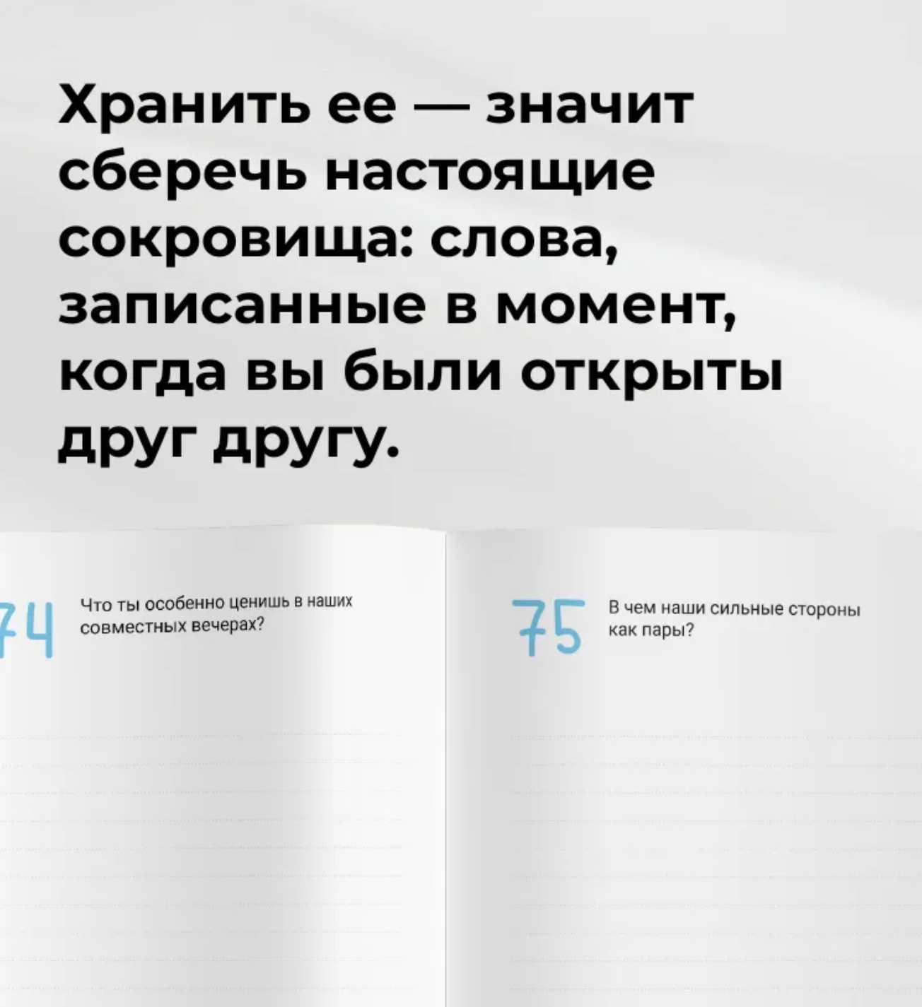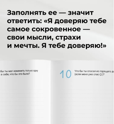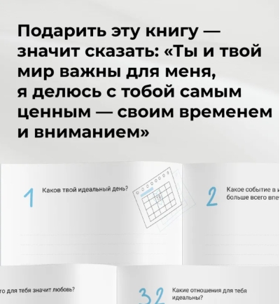 Это не просто анкета, а бережно созданное пространство для диалога. Каждый ответ — штрих к портрету любимого. Каждый ответ — мост к еще большей эмоциональной близости. Книга помогает не только сохранить воспоминания, но и открыть новые грани в, казалось бы, хорошо знакомом человеке. Ответы, рисунки и фото превратят этот дневник в уникальный артефакт, «капсулу времени».