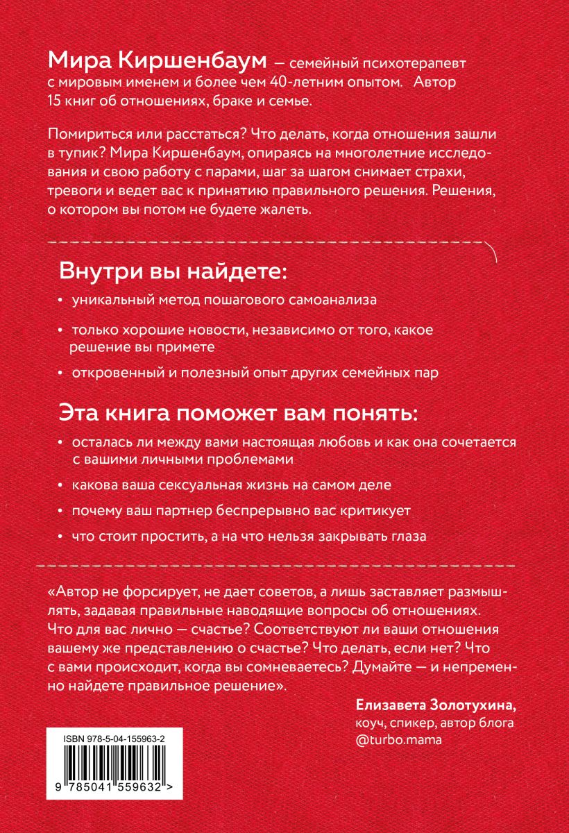 С помощью своей уникальной методики семейный психотерапевт с мировым именем Мира Киршенбаум поможет вам провести полную диагностику ваших отношений. Почувствовать, в чем суть проблем, и отыскать ключи к их решению. Что бы вы ни решили - расстаться или остаться - эта книга поддержит вас в трудную минуту и уж точно повысит самооценку. Пришла пора узнать правду о ваших отношениях. И кто сказал, что она будет неприглядна? Просто наберитесь смелости и честно ответьте на ряд самодиагностических вопросов.