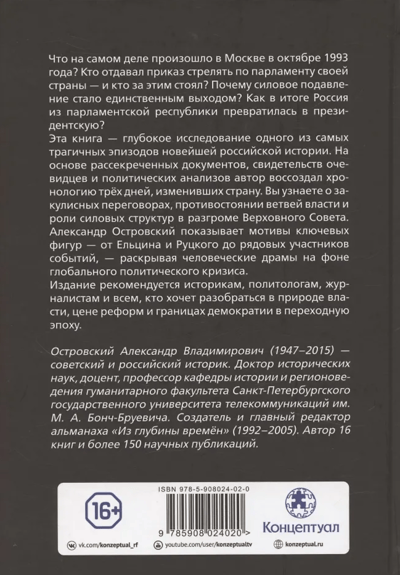 Эта книга – второе издание первого исторического исследования трагедии 1993 года. Изучив все доступные материалы, перепроверив показания участников и очевидцев, автор не только подробно, по часам и минутам, восстанавливает ход событий, но и дает глубокий анализ причин трагедии, вскрывает тайные пружины роковых решений и приходит к сенсационным выводам…