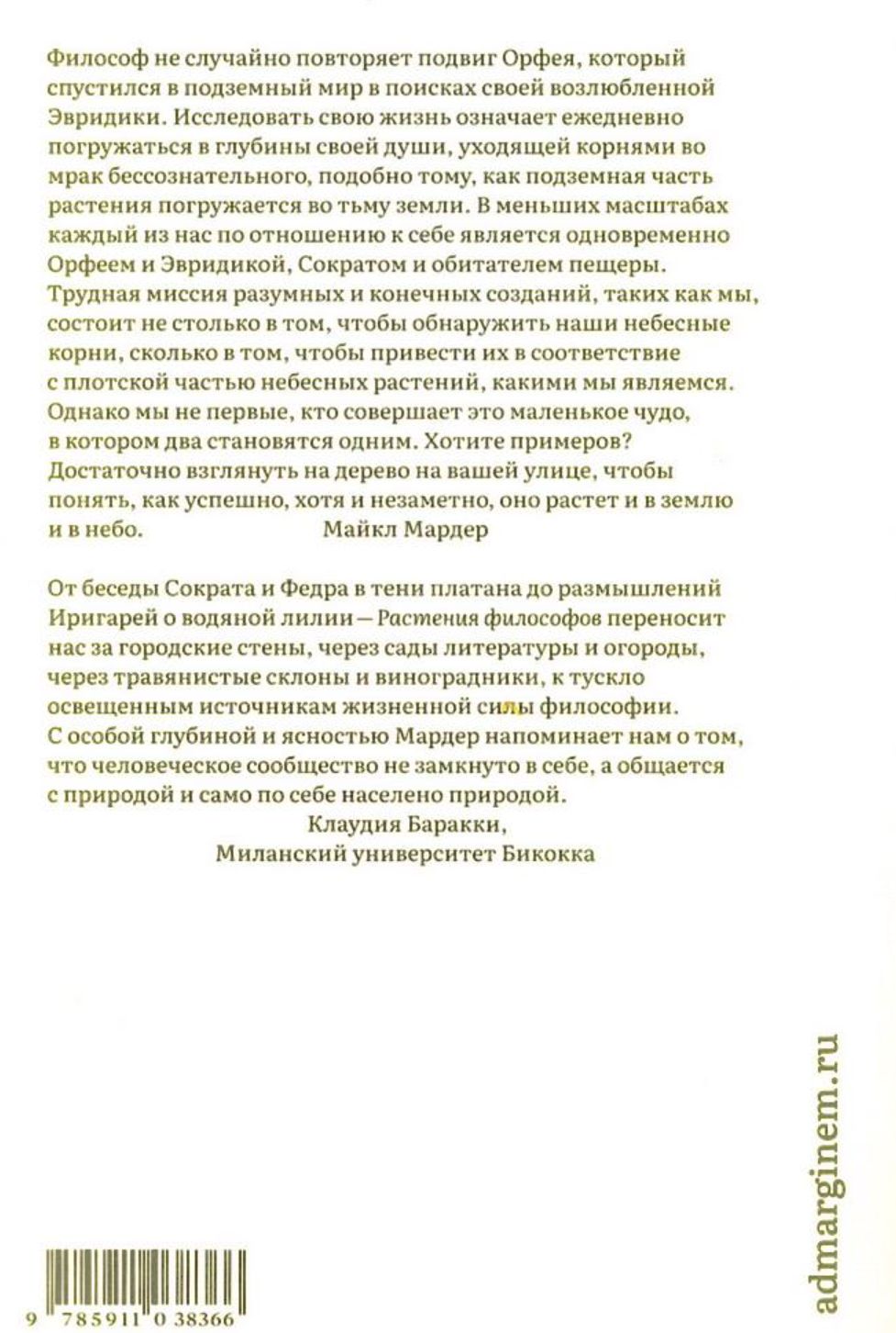 Перешагнув «за» физику, почтенная метафизическая традиция философии продолжила питаться от своей природной основы, регулярно обращаясь к растительным метафорам и аллегориям, но оставляя их на периферии своего внимания и тем самым «обесценивая, инструментализируя и делая банальной» саму жизнь. Майкл Мардер решается на деконструкцию этой почти бессознательной привычки философов от Античности до современности, выявляя сокрытую в тени магистральной мысли растительную философию, которая в буквальном смысле прорастает в трудах двенадцати знаменитых философов от Платона до Люс Иригарей. Пальма Маймонида, виноград Гегеля, подсолнухи Деррида и прочие «растения философов» показывают себя не просто «засушенным в книгах» гербарием, сентиментальным дополнением, но важным аспектом даже тех философских систем, чей путь к интеллектуальным и духовным высям лежал через экоцид.
