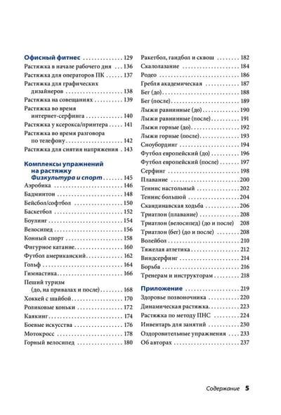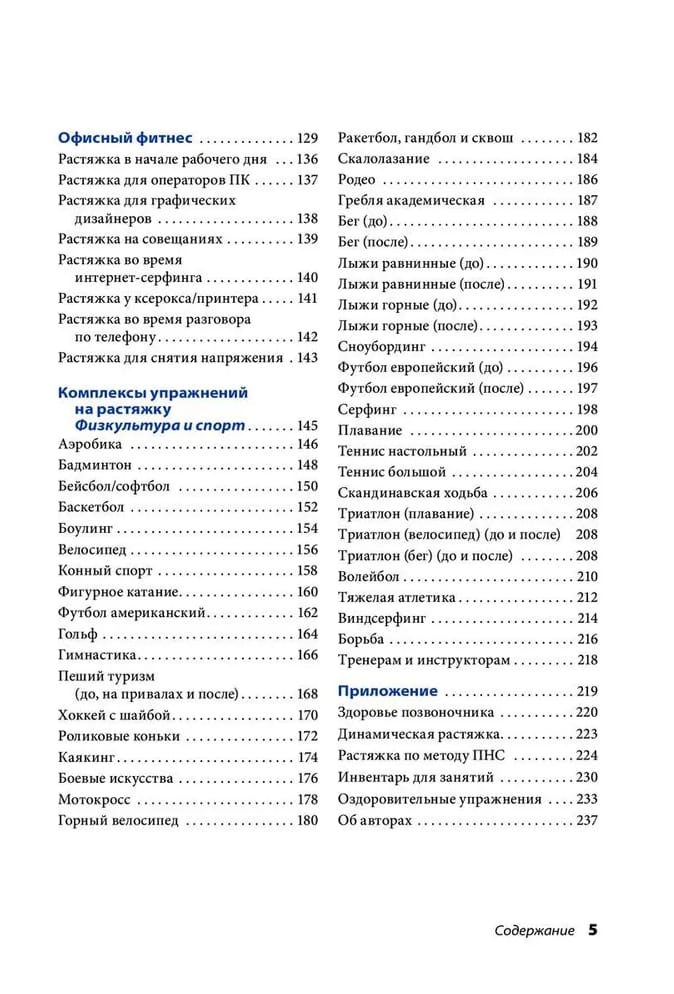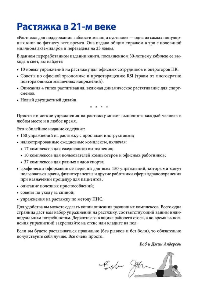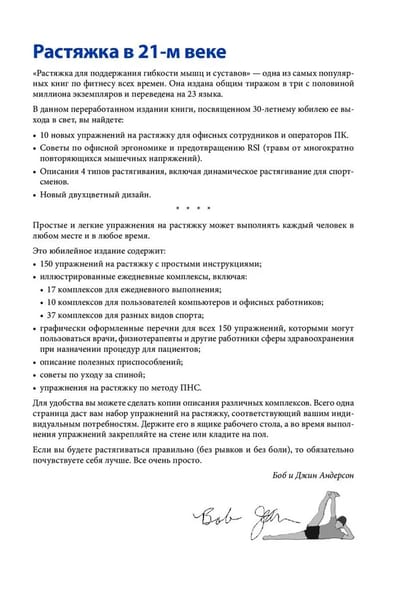 Перед вами новая редакция одной из самых популярных книг по фитнесу всех времен. Общий тираж оригинального издания во всем мире превысил 3,5 миллиона экземпляров. Книга переведена на 23 языка. Представленные в ней упражнения на растяжку эффективно развивают гибкость мышц и подвижность суставов, что позволяет интенсивно тренироваться, выполняя движения с полной амплитудой без риска возникновения травм. Что нового в этом издании? Вы найдете здесь 10 дополнительных комплексов для офисных работников и пользователей ПК, а также советы по офисной эргономике и предотвращению травм.