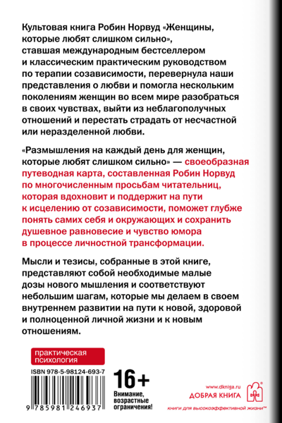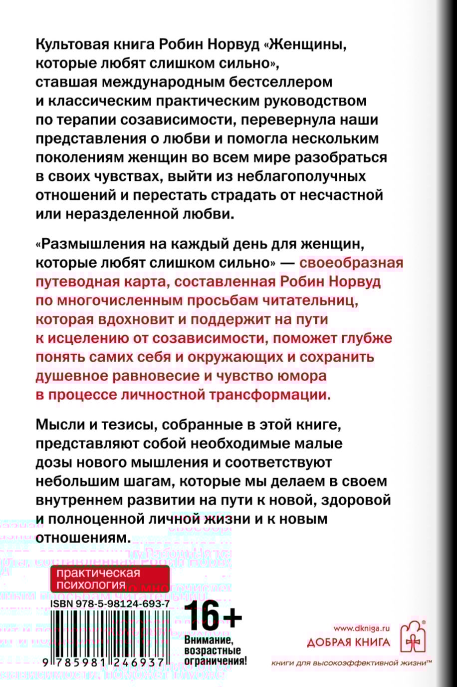 «Размышления на каждый день для женщин, которые любят слишком сильно» — своеобразная путеводная карта, составленная Робин Норвуд по многочисленным просьбам читательниц, которая вдохновит и поддержит на пути к исцелению от созависимости, поможет глубже понять самих себя и окружающих и сохранить душевное равновесие и чувство юмора в процессе личностной трансформации.