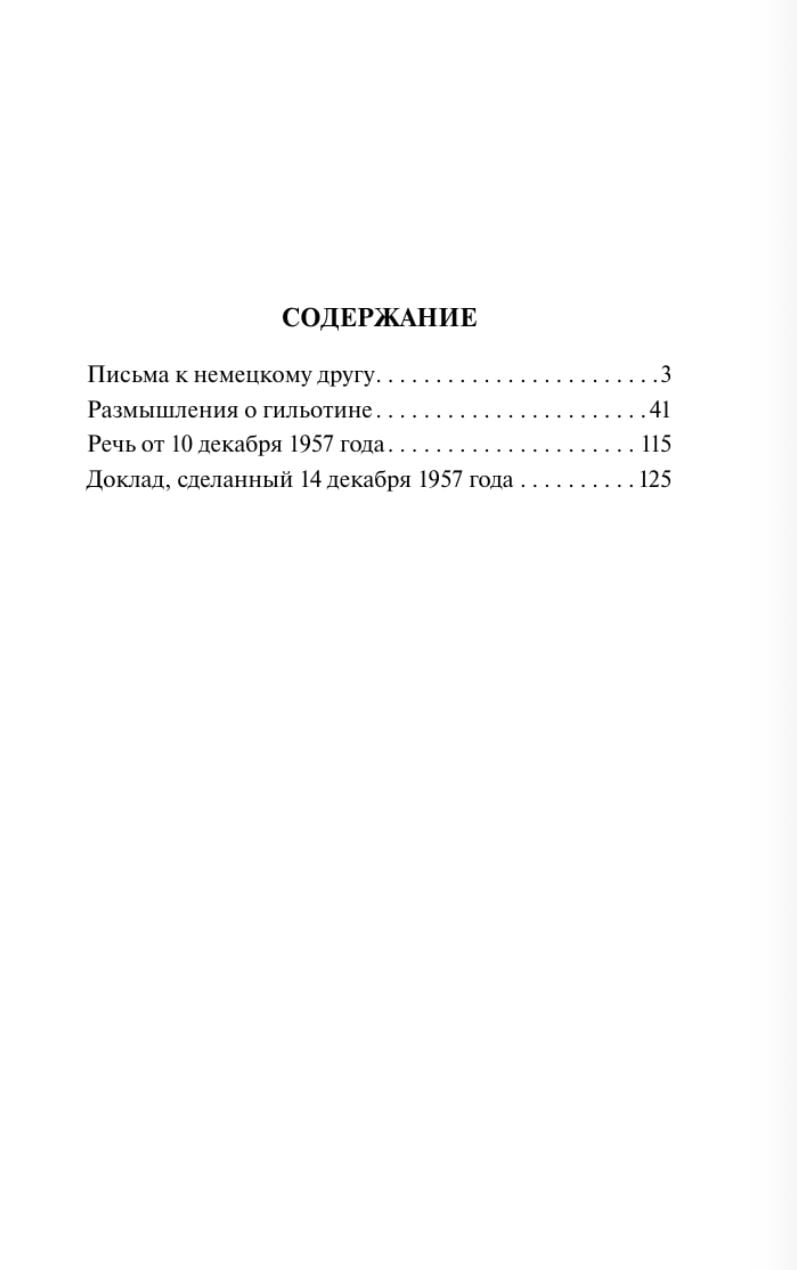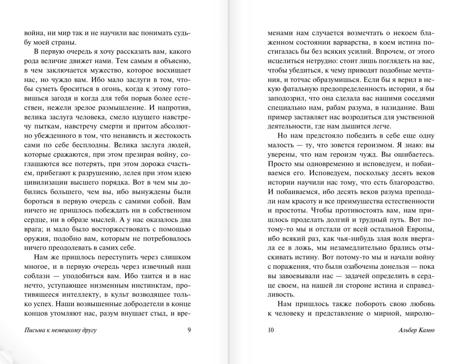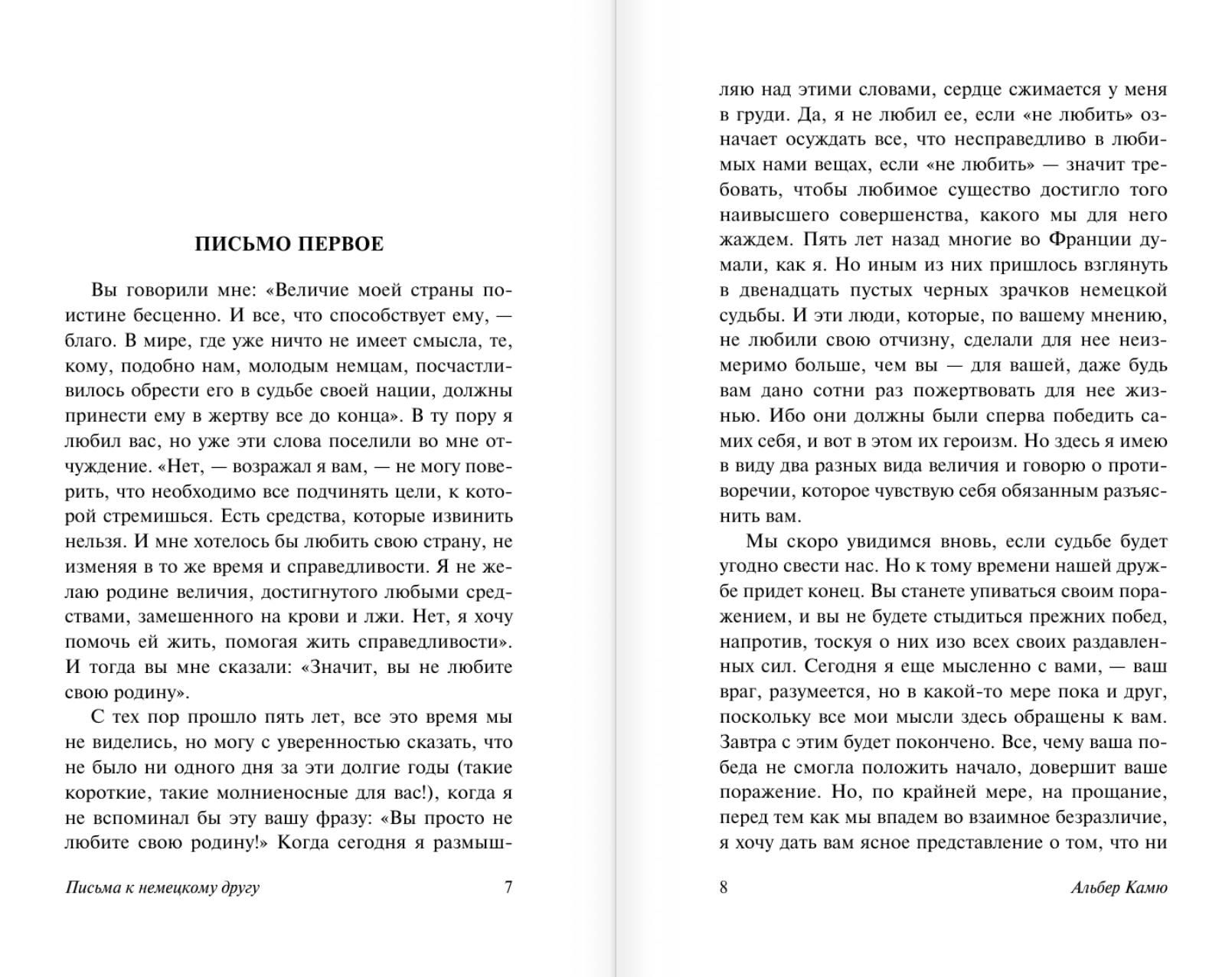 Уже при жизни Альбера Камю называли «Совестью Запада», Нобелевскую премию ему вручили за «важную литературную работу, которая с ясной серьезностью освещает проблемы человеческой совести в наше время». О неприятии Камю жестокости и насилия свидетельствует как его жизнь, так и его работы. В эссе «Размышления о гильотине», вышедшем, когда во Франции еще применяли смертную казнь, он говорит о ее неэффективности, рассматривает ее как пережиток прошлого. В «шведских речах», произнесенных на вручении Нобелевской премии и в универститете Упсалы, Камю рассуждает о роли писателя в мире, целях искусства и призвании творца служить обществу, не поддаваясь лжи и грубой силе. «Письма к немецкому другу», написанные во время Второй мировой войны, когда Камю работал редактором подпольной газеты, сам автор назвал «документальным рассказом о борьбе против насилия».