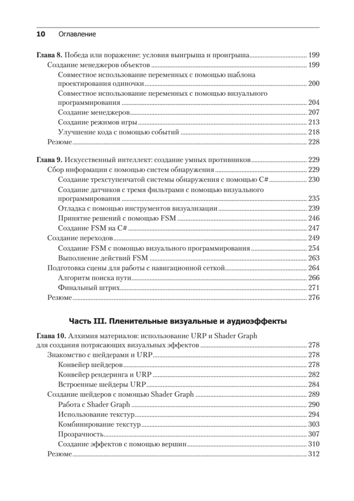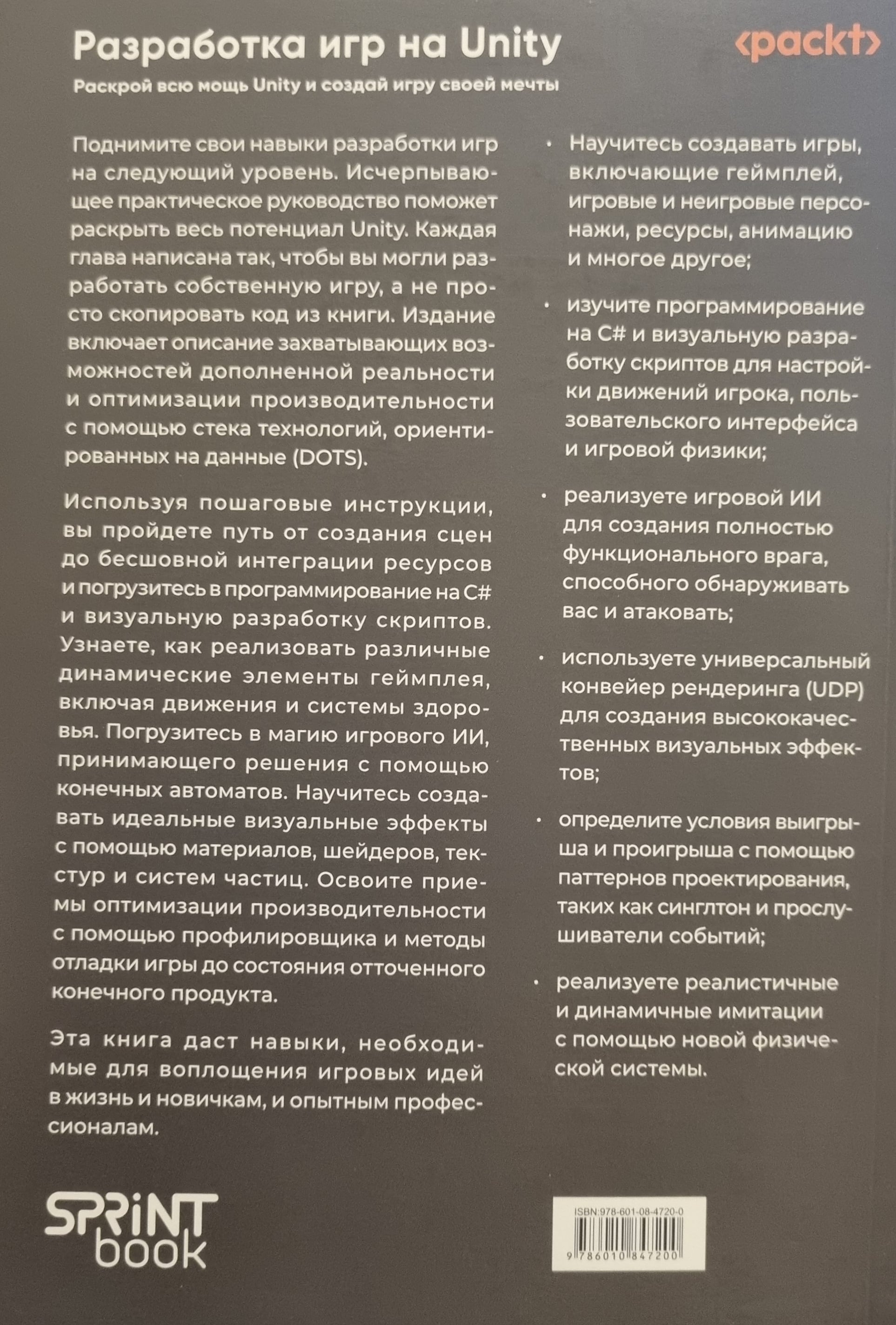 Поднимите свои навыки разработки игр на следующий уровень. Исчерпывающее практическое руководство поможет раскрыть весь потенциал Unity. Каждая глава написана так, чтобы вы могли разработать собственную игру, а не просто скопировать код из книги. Издание включает описание захватывающих возможностей дополненной реальности и оптимизации производительности с помощью стека технологий, ориентированных на данные (DOTS). Используя пошаговые инструкции, вы пройдете путь от создания сцен до бесшовной интеграции ресурсов и погрузитесь в программирование на C# и визуальную разработку скриптов. Узнаете, как реализовать различные динамические элементы геймплея, включая движения и системы здоровья. Погрузитесь в магию игрового ИИ, принимающего решения с помощью конечных автоматов. Научитесь создавать идеальные визуальные эффекты с помощью материалов, шейдеров, текстур и систем частиц. Освоите приемы оптимизации производительности с помощью профилировщика и методы отладки игры до состояния отточенного конечного продукта. Эта книга даст навыки, необходимые для воплощения игровых идей в жизнь и новичкам, и опытным профессионалам.