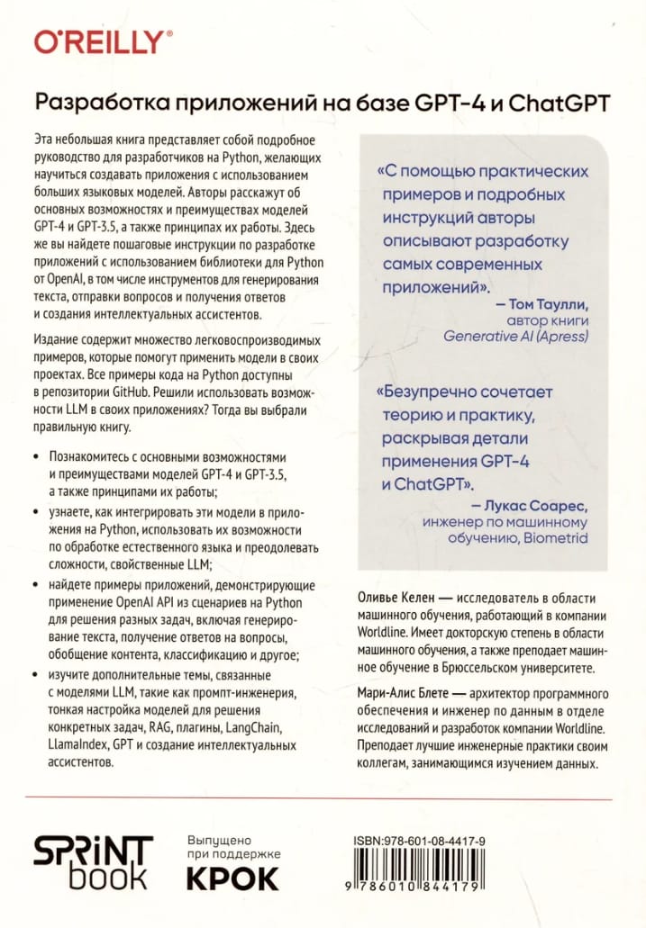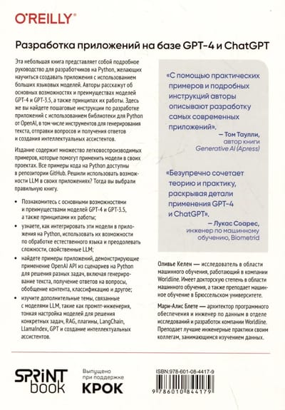 «Разработка приложений на базе GPT-4 и ChatGPT» содержит множество легковоспроизводимых примеров, которые помогут освоить особенности применения моделей в своих проектах. Все примеры кода на Python доступны в репозитории GitHub. Решили использовать возможности LLM в своих приложениях? Тогда вы выбрали правильную книгу.